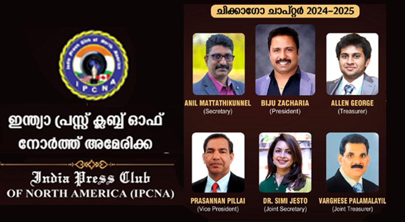 ചിക്കാഗോ: ഇന്ത്യാ പ്രസ്ക്ലബ്ബ് ഓഫ് നോർത്ത് അമേരിക്കയുടെ ചിക്കാഗോ ചാപ്റ്ററിന് പുതു നേതൃത്വം. 2024 – 2025 വർഷത്തേക്കുള്ള എക്സിക്യൂട്ടീവ് ബോർഡിലെ പ്രസിഡൻ്റ് ആയി ബിജു സഖറിയാ (ഫ്ളവേഴ്സ് ടിവി USA ) പ്രസിഡണ്ട്, സെക്രട്ടറിയായി അനിൽ മറ്റത്തിക്കുന്നേൽ (ഏഷ്യാനെറ്റ് യുഎസ് വീക്കിലി റൗണ്ടപ്പ്), ട്രഷറർ ആയി അലൻ ജോർജ്ജ് (ഏഷ്യാനെറ്റ് ന്യൂസ്), വൈസ് പ്രസിഡൻ്റ് ആയി പ്രസന്നൻ പിള്ളൈ (കൈരളി ടിവി), ജോയിന്റ് സെക്രട്ടറിയായി ഡോ സിമി ജെസ്റ്റോ (ഏഷ്യാനെറ്റ് യുഎസ് വീക്ക് ലി റൗണ്ടപ്പ് ), ജോയിന്റ് ട്രഷറർ ആയി വർഗ്ഗീസ് പാലമലയിൽ (എൻ ആർ ഐ റിപ്പോർട്ടർ) എന്നിവരാണ് തെരഞ്ഞെടുക്കപ്പെട്ടത്. പ്രസിഡണ്ട് ശിവൻ മുഹമ്മയുടെ അധ്യക്ഷതയിൽ കൂടിയ ബോർഡ് മീറ്റിങ്ങിലാണ് പുതിയ ഭാരവാഹികളെ തെരെഞ്ഞെടുത്തത്. ഇന്ത്യാ പ്രസ്ക്ലബ്ബ് ഓഫ് നോർത്ത് അമേരിക്കയുടെ നാഷണൽ അഡ്വൈസറി ബോർഡ് ചെയർമാൻ ബിജു കിഴക്കേക്കുറ്റ് യോഗത്തിൽ മുഖ്യാതിഥിയായി പങ്കെടുത്തു.