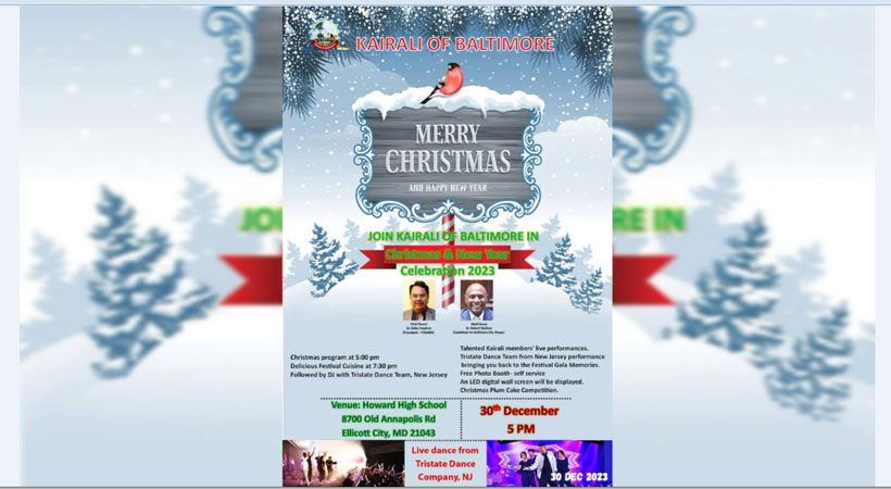 വാഷിംഗ്ടണ്: അമേരിക്കയിലെ പ്രമുഖ മലയാളി സംഘടനയായ കൈരളി ഓഫ് ബാള്ട്ടിമോറിന്റെ ക്രിസ്മസ്, പുതുവത്സര ആഘോഷങ്ങള് ഡിസംബര് 30ന് എല്ലികോട്ട് സിറ്റിയിലെ ഹവാര്ഡ് ഹൈസ്കൂളില് (Howard High School, 8700 Old Annapolis Rd, Ellicott City, MD 21043) സംഘടിപ്പിക്കുന്നു.