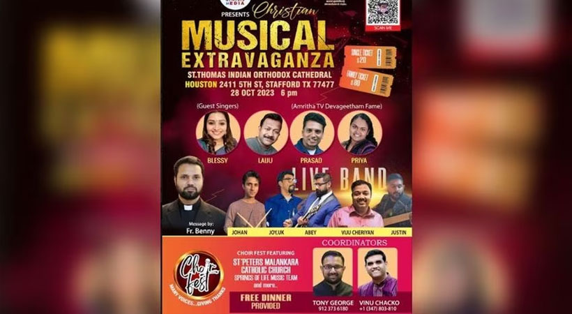 Endocrine and Diabetes plus Clinic of Houston ആണ് മുഖ്യ സ്പോണ്സര്. Skypass Travel കൂടി ചേര്ന്നാണ് പരുപാടി സംഘടിപ്പിക്കുന്നത്. ഭക്തി സാന്ദ്രമായ അവിസ്മരണീയ ക്രിസ്ത്യന് ഗാനമേളയോടൊപ്പം സെയിന്റ് പീറ്റേഴ്സ് മലങ്കര കത്തോലിക്ക ദേവാലയത്തിന്റെയും spring of life music team യും choir fest ഉണ്ടായിരിക്കുന്നതാണ് ഭക്തി സാന്ദ്രവും മനസിനെ ഉണര്ത്തുന്നതുമായ മനോഹരമായ ഒരു സന്ധ്യ പങ്കെടുക്കുന്നവര്ക്ക് ഉറപ്പാണെന്നും ടിക്കറ്റ് വില്പന തുടങ്ങിയെന്നും സംഘടകര് ടോണി ജോര്ജ്, വിനു ചാക്കോ എന്നിവര് അറിയിച്ചു.