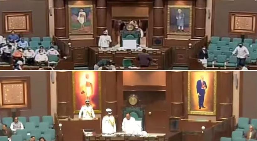 ഒരു വശത്ത് മഹാത്മാഗാന്ധിയുടെ ഛായാചിത്രം ഇപ്പോഴും പ്രദര്ശിപ്പിച്ചിരിക്കുന്നു, സ്പീക്കറുടെ കസേരയുടെ മറുവശത്ത് ജവഹര്ലാല് നെഹ്റുവിന്റെ ചിത്രം മാറ്റി അംബേദ്കറെ വെച്ചതിനെതിരെ കോണ്ഗ്രസ് രംഗത്തുവന്നിരുന്നു. ജവഹര്ലാല് നെഹ്റുവിന്റെ ചിത്രം പുനഃസ്ഥാപിക്കണമെന്ന് കോണ്ഗ്രസ് നേതാക്കള് ആവശ്യപ്പെടുകയും മാറ്റത്തെ എതിര്ക്കുകയും ചെയ്തു. ചിത്രം പഴയ നിലയിലേക്ക് പുനഃസ്ഥാപിച്ചില്ലെങ്കില് കോണ്ഗ്രസ് എംഎല്എമാര് തന്നെ അത് ചെയ്യുമെന്ന് പാര്ട്ടി മുന്നറിയിപ്പ് നല്കി.