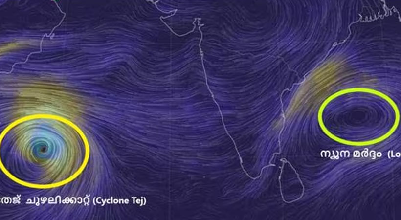തിരുവനന്തപുരം: അറബിക്കടലില് രൂപപ്പെട്ട തേജ് ചുഴലിക്കാറ്റ് അടുത്ത 12 മണിക്കൂറിനുള്ളില് തീവ്ര ചുഴലിക്കാറ്റായും പിന്നീടുള്ള 24 മണിക്കൂറിനുള്ളില് അതി തീവ്ര ചുഴലിക്കാറ്റായും ശക്തിപ്രാപിക്കാന് സാധ്യതയെന്ന് കേന്ദ്ര കാലാവസ്ഥ വകുപ്പ്. തെക്ക് പടിഞ്ഞാറന് അറബിക്കടലിനു മുകളിലായി സ്ഥിതി ചെയ്തിരുന്ന അതി തീവ്രന്യൂനമര്ദ്ദമാണ് ചുഴലിക്കാറ്റായി ശക്തി പ്രാപിച്ചത്. നിലവില് തെക്ക് കിഴക്കന് ബംഗാള് ഉള്ക്കടലിനും മധ്യ-കിഴക്കന് ബംഗാള് ഉള്ക്കടലിനും മുകളിലായി ന്യൂനമര്ദ്ദം സ്ഥിതിചെയ്യുന്നു.