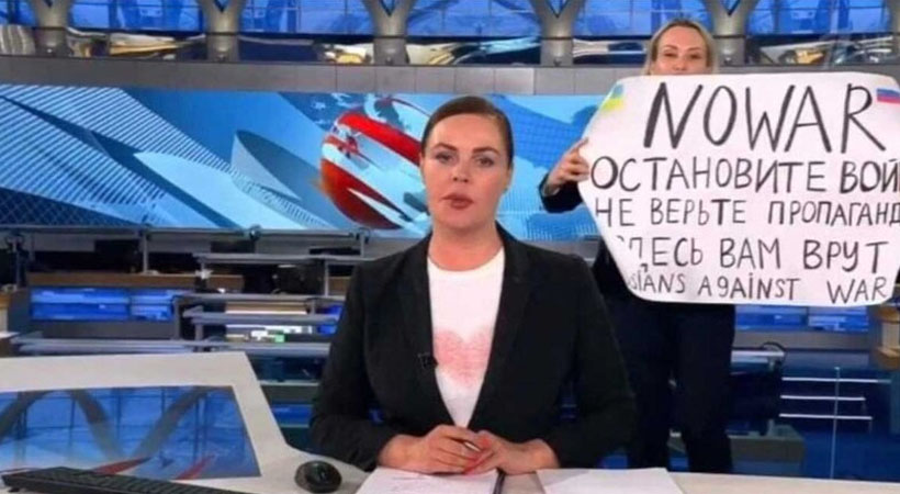 2022 മാർച്ച് 14ന് വ്രമ്യ എന്ന വൈകുന്നേരത്തെ വാർത്താ പരിപാടിയിൽ ഉക്രെയ്നിലെ റഷ്യൻ അധിനിവേശത്തെക്കുറിച്ച് അവതാരക എകാർട്ടീന ആന്ദ്രീവ സംസാരിച്ചുകൊണ്ട് ഇരുന്നപ്പോൾ പിന്നിലായി പ്ലക്കാർഡ് ഉയർത്തി പ്രതിഷേധിക്കുകയാണ് മറീന ചെയ്തത്. ഇംഗ്ലീഷിലും റഷ്യൻ ഭാഷയിലും ഉള്ള ആ വാചകങ്ങൾ പറയുന്നത് ഇങ്ങനെ – ‘യുദ്ധം നിർത്തൂ, നിങ്ങളോട് ഇവർ കള്ളം പറയുകയാണ്. ഇവരുടെ പ്രചാരണങ്ങളിൽ വിശ്വസിക്കരുത്’. പിന്നാലെ അവർ ഉച്ചത്തിൽ പറഞ്ഞു ‘യുദ്ധം നിർത്തൂ’. ഏതാനും സെക്കൻഡുകൾ കഴിഞ്ഞപ്പോൾ ആ പരിപാടിയുടെ സംപ്രേഷണം അവസാനിപ്പിച്ചു. മാർച്ച് 17ന് മറീന ചാനലിൽ നിന്ന് രാജിവച്ചതായും വാർത്തകൾ വന്നിരുന്നു.