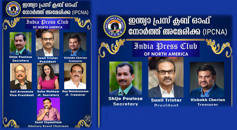 അടുത്ത രണ്ടു വര്ഷത്തേക്കുള്ള മാധ്യമപ്രവര്ത്തകരുടെ കൂട്ടായ്മയായ ഇന്ത്യ പ്രസ് ക്ലബ് ഓഫ് നോര്ത്ത് അമേരിക്കയുടെ പ്രവര്ത്തങ്ങള്ക്ക് സാമൂഹ്യ, സാംസ്കാരിക സംഘടനകളുടെയും ജനങ്ങളുടെയും എല്ലാ മാധ്യമ രംഗത്ത് പ്രവര്ത്തിക്കുന്നവരുടെയും കൂട്ടായ സഹകരണം പ്രതീക്ഷിക്കുന്നതായി പ്രസിഡന്റ് സുനില് ട്രൈസ്റ്റാറും മറ്റു നാഷണല് എക്സിക്യൂട്ടീവ് കമ്മിറ്റി അംഗങ്ങളും അഭ്യര്ത്ഥിച്ചു. www.indiapressclub.org
