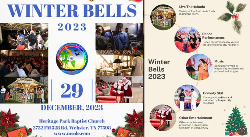 ലീഗ് സിറ്റി (ടെക്സാസ്): മലയാളി സമാജം ഓഫ് ലീഗ് സിറ്റിയുടെ ഈ വര്ഷത്തെ ക്രിസ്തുമസ് ന്യൂ ഇയര് കൂട്ടായ്മ വിന്റര്ബെല്സ്-2023, 29 ഡിസംബര് 2023 ന് വൈകിട്ട് 5 മണിക്ക് ഹെറിറ്റേജ് പാര്ക്ക് ബാപ്റ്റിസ്റ്റ് ചര്ച്ച്, വെബ്സ്റ്ററില് വെച്ചു നടത്തപ്പെടും. കഴിഞ്ഞ വര്ഷങ്ങളില് എന്നപോലെതന്നെ ഈ വര്ഷവും വലിയ ആഘോഷപരിപാടികളാണ് സംഘടിപ്പിക്കുന്നത്. ലീഗ് സിറ്റി മലയാളികള്ക്ക് എന്നും ഇത് മറക്കാനാവാത്ത ഒരു ഉത്സവമാണ്, അതുകൊണ്ടുതന്നെ ഈ പ്രദേശത്തുള്ള എല്ലാ മലയാളികളുംതന്നെ മറ്റെല്ലാം മാറ്റിവെച്ചു വളരെ സന്തോഷത്തോടെ ഇതിന്റെ ഭാഗമായിമാറുന്നു.