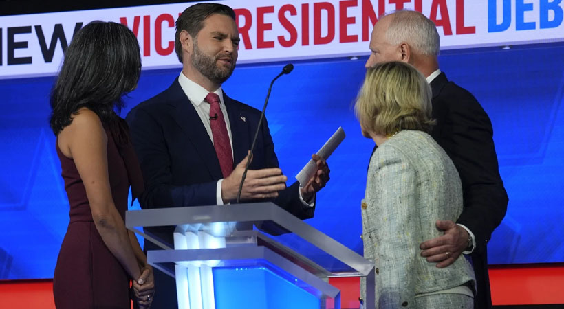 ന്യൂയോർക്ക് സിറ്റിയിലെ സിബിഎസ് ന്യൂസ് ബ്രോഡ്കാസ്റ്റ് സെൻ്ററിൽ ചൂടേറിയ വൈസ് പ്രസിഡൻ്റ് ഡിബേറ്റിനു ശേഷം നടന്നത് ഹൃദ്യമായ കാര്യങ്ങൾ. ക്യാമറകൾ ഓഫ് ആയ ശേഷം , വാൾസും വാൻസും പോഡിയത്തിൽ സമീപം നിന്നുതന്നെ കൈകൾ കൂപ്പി നേരെ നോക്കി. പിന്നീട് അവർ ഹസ്തദാനം ചെയ്തു സംസാരിച്ചു.ചിരിച്ചുകൊണ്ട് ഇരുവരും സംസാരിക്കുകയും പുറത്തു തട്ടി അഭിനന്ദിക്കുകയും ചെയ്തു. ട്രംപായിരുന്നെങ്കിൽ ഇങ്ങനെയൊന്ന് ചിന്തിക്കാനെ സാധിക്കുമായിരുന്നില്ല.