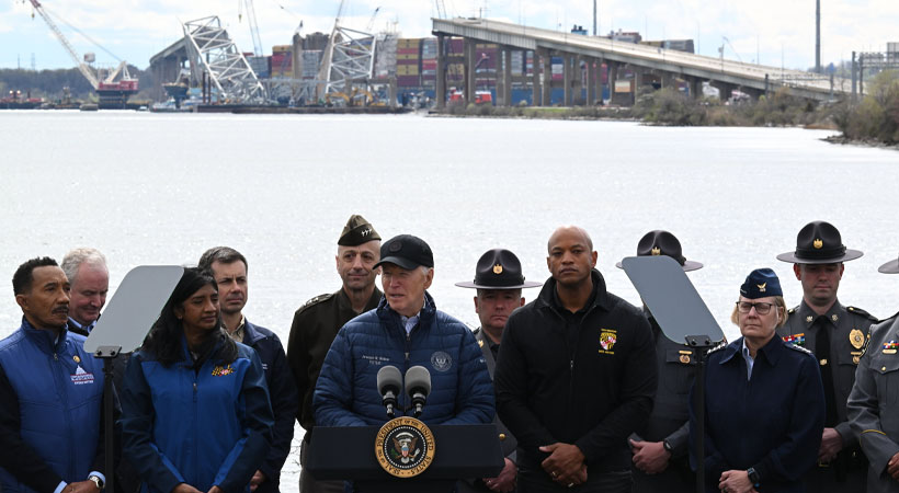 മാർച്ച് 26 ന് ബാൾട്ടിമോറിൽ ചരക്ക് കപ്പൽ ഇടിച്ചു അപകടത്തിൽപ്പെട്ട ഫ്രാൻസിസ് സ്കോട്ട് കീ പാലം പ്രസിഡൻ്റ് ജോ ബൈഡൻ സന്ദർശിച്ചു. മറൈൻ വൺ ഹെലികോപ്റ്ററിൽ, ബൈഡൻ ദുരന്ത സ്ഥലത്തിന് മുകളിലൂടെ പറന്നു സ്ഥിതിഗതികൾ വിലയിരുത്തി. തുറമുഖത്തിന്റെ പുനരുദ്ധാരണ പ്രവൃത്തികൾ പുരോഗമിക്കെ എല്ലാ ഉദ്യോഗസ്ഥരമായും ജീവനക്കാരുമായും ബൈഡൻ സംസാരിച്ചു.