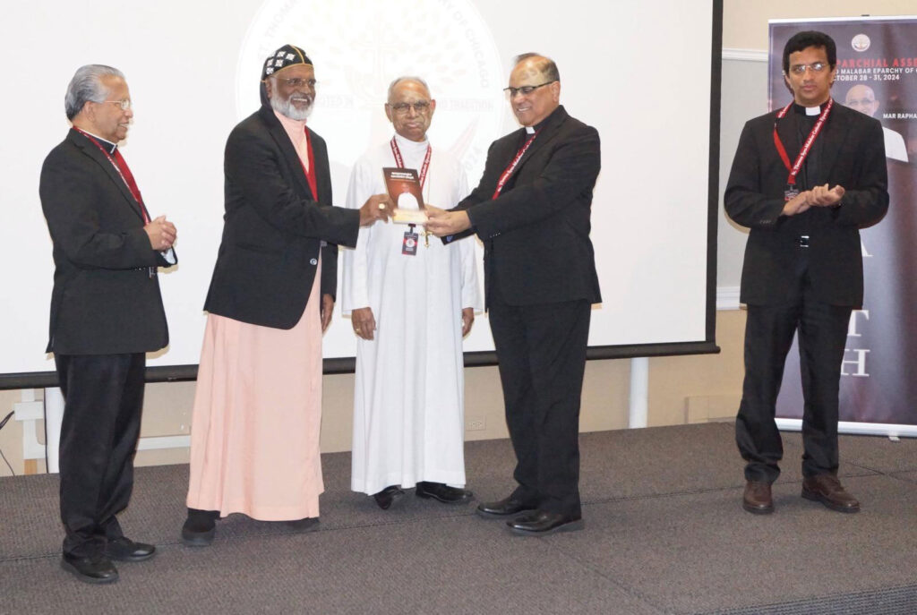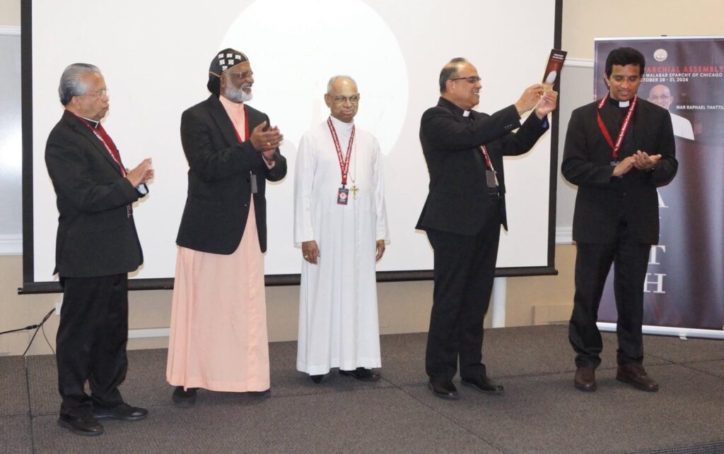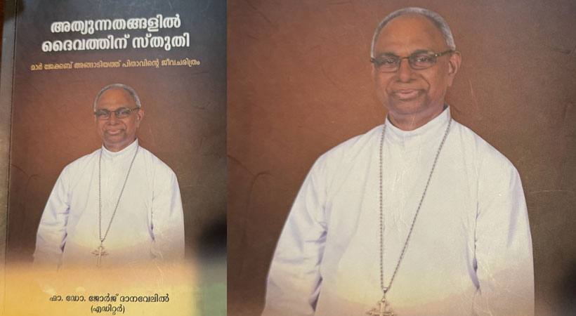 ചിക്കാഗോ സിറോ മലബാര് രൂപതയുടെ പ്രഥമ മെത്രാന്മാര് ജേക്കബ് അങ്ങാടിയത്തിന്റെ ജീവചരിത്രം ‘അത്യുന്നതങ്ങളില് ദൈവത്തിനു സ്തുതി’ ചിക്കാഗോയില് നടന്ന സിറോ മലബാര് എപ്പാര്ക്കിയല് അസ്സംബ്ലിയുടെ സമാപന സമ്മേളത്തില് വെച്ച് ബിഷപ്പ് മാര് ജോയ് ആലപ്പാട്ട്, സിറോ മലങ്കര രൂപത ബിഷപ്പ് ഫിലിപ്പോസ് മാര് സ്റ്റീഫനോസിന് ആദ്യപ്രതി നല്കി പ്രകാശനം ചെയ്തു.
