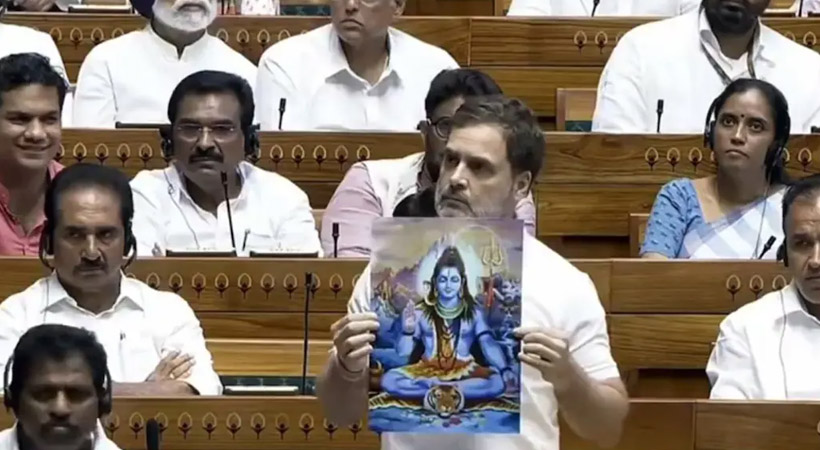 പരമശിവന്റെ ചിത്രം ലോക്സഭയില് ഉയര്ത്തിപ്പിടിച്ചായിരുന്നു രാഹുല് ഗാന്ധിയുടെ വിമർശനങ്ങൾ. പ്രതിപക്ഷം ആരേയും ഭയക്കുന്നില്ലെന്നും സത്യമാണ് തങ്ങളുടെ ആയുധമെന്നും പറഞ്ഞുകൊണ്ടായിരുന്നു അദ്ദേഹം ചിത്രം ഉയർത്തിയത്. “ശിവന്റെ ചിത്രത്തിലേക്ക് നോക്കിയാൽ നിങ്ങൾക്കറിയാം, ഹിന്ദുക്കൾക്ക് ഭയമോ വിദ്വേഷമോ പ്രചരിപ്പിക്കാൻ ആവില്ലെന്നത്. എന്നാൽ ബിജെപി മുഴുവൻ സമയവും വിദ്വേഷം പ്രചരിപ്പിക്കുകയാണ്,” ചിത്രം ഉയർത്തി രാഹുൽ പറഞ്ഞു.