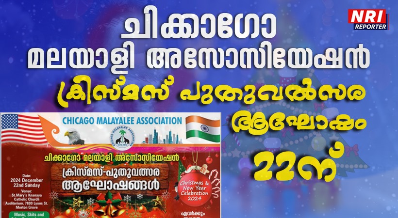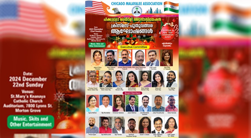 ചിക്കാഗോ: ചിക്കാഗോ മലയാളി അസോസിയേഷൻ ക്രിസ്മസ് – പുതുവൽസര ആഘോഷം ഡിസംബർ 22 ഞായറാഴ്ച മോർട്ടൻഗ്രോവ് സെൻ്റ് മേരീസ് ക്നാനായ കത്തോലിക്കാ പള്ളി ഓഡിറ്റോറിയത്തിൽ നടക്കും. സംഗീതം, നൃത്തം, സ്കിറ്റുകൾ തുടങ്ങി നിരവധി കലാ സാംസ്കാരിക പരിപാടികൾ അരങ്ങേറും.