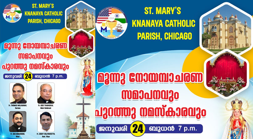 ചിക്കാഗോ: ചിക്കാഗോ സെൻ്റ് മേരീസ് ക്നാനായ കത്തോലിക്കാ ഇടവക ദേവാലയത്തില് പുറത്തുനമസ്കാരവും മൂന്നു നോമ്പ് ആചരണത്തിന്റെ സമാപനവും ജനുവരി 24 ബുധനാഴ്ച വൈകിട്ട് നടക്കും. ഡിട്രോയിറ്റ് സെന്റ് മേരീസ് ക്നാനായ ഇടവക വികാരി ഫാ. ജോസ് തറക്കല് പുറത്തു നമസ്കാര ശുശ്രൂഷകള്ക്ക് മുഖ്യ കാര്മികത്വം വഹിക്കും. ചിക്കാഗോ സിറോ മലബാര് രൂപത വികാരി ജനറലും ക്നാനായ റീജന് ഡയറക്ടറുമായ മോണ്: തോമസ് മുളവനാല് സന്ദേശം നല്കും.