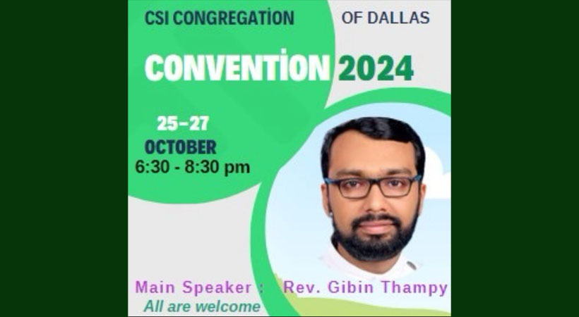 ഗാർലൻഡ് (ഡാളസ്): സിഎസ്ഐ കോൺഗ്രിഗേഷൻ ഓഫ് ഡാലസ് വാർഷിക കൺവെൻഷൻ ഒക്ടോബർ 25 മുതൽ 27 വരെ വൈകീട്ട് 6.30 മുതൽ 8 .30 വരെ നടക്കും.