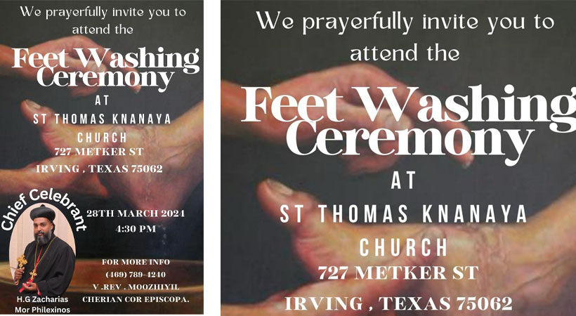 ഒരു മെത്രാപ്പോലീത്തായുടെ നേതൃത്വത്തിൽ പന്ത്രണ്ട് വൈദീകരുടെ കാൽപാദം കഴുകുന്ന ശുശ്രുഷ വളരെ അപൂർവ്വമായിട്ടാണ് ഡാളസിൽ നടത്തപ്പെടുന്നത്. ഈ ശുശ്രുഷയിൽ പങ്കാളികൾ ആകുവാൻ എല്ലാ വിശ്വാസികളെയും ക്ഷണിക്കുന്നതായി ഇടവക വികാരി വെരി. റവ.മൂഴിയിൽ ചെറിയാൻ കോർ എപ്പിസ്കോപ്പ അറിയിച്ചു.