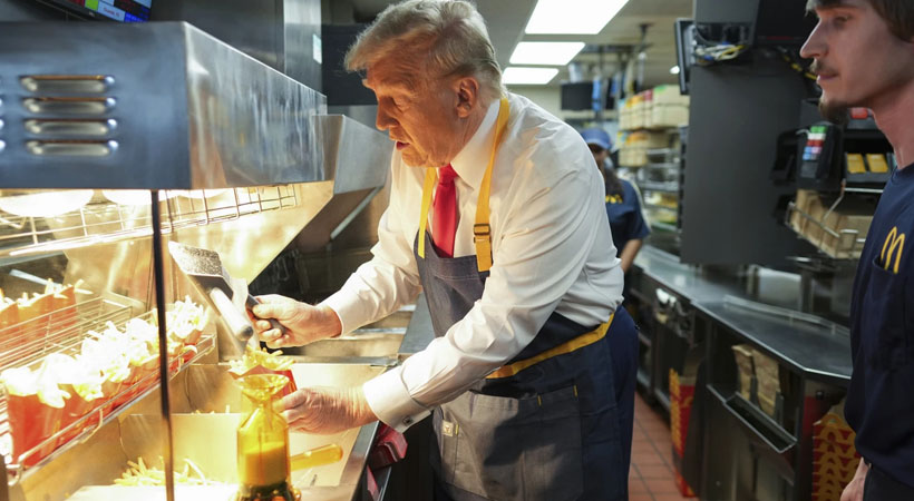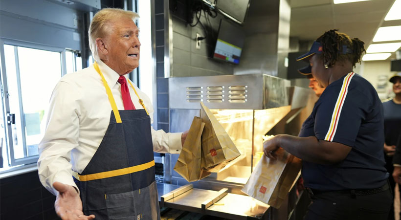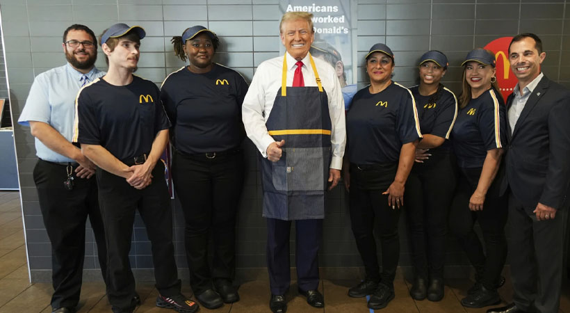തിരഞ്ഞെടുപ്പ് പ്രചാരണച്ചൂടിനിടെ ആളുകൾക്ക് കൌതുകം ഒരുക്കി റിപ്പബ്ളിക്കൻ സ്ഥാനാർഥി ഡോണൾഡ് ട്രംപ്. ഞായറാഴ്ച ഫിലാഡൽഫിയ ഏരിയയിലെ ഒരു മക്ഡൊണാൾഡ് സ്റ്റോറിൽ ജീവനക്കാരനായി മാറി ട്രംപ്. ഡ്രൈവ് ത്രൂ വിൻഡോയിലൂടെ അവിടെ എത്തിയവരുമായി സംസാരിച്ചു. ഫ്രഞ്ച് ഫ്രൈസ് വിളമ്പി.