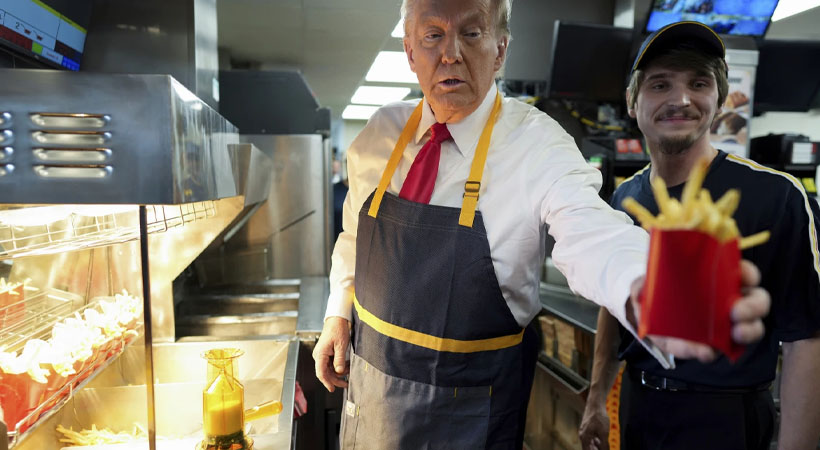 റിപ്പോർട്ടർമാരും മക്ഡൊണാൾഡ് ജീവനക്കാരും നോക്കിനിൽക്കെ, ഒരു ജോലിക്കാരൻ ട്രംപിന് ഫ്രൈകൾ എണ്ണയിൽ മുക്കി പൊരിക്കുന്നതെങ്ങനെ, ഉപ്പ് ചേർക്കുന്നതെങ്ങനെ, ഒരു സ്കൂപ്പ് ഉപയോഗിച്ച് ബോക്സുകളിൽ ഇടുന്നത് എങ്ങനെ എന്നൊക്കെ കാണിച്ചുകൊടുത്തു. ഫാസ്റ്റ് ഫുഡിൻ്റെ അറിയപ്പെടുന്ന ആരാധകനായ ട്രംപ് ഇതെല്ലാം കണ്ട് അത്ഭുതം പ്രകടിപ്പിച്ചു.