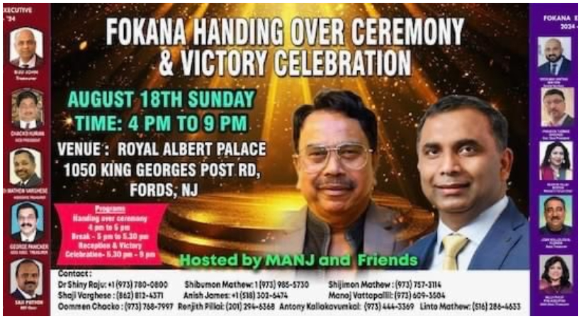 2024-2026 കാലയളവിൻ്റെ ഔദ്യോഗിക തുടക്കം കുറിച്ചുക്കൊണ്ട്, പ്രസിഡൻ്റ് സജിമോൻ ആൻ്റണിയുടെ നേതൃത്വത്തിൽ, പുതുതായി തിരഞ്ഞെടുക്കപ്പെട്ട ടീമിലേക്ക് നിലവിലെ ഫൊക്കാന ടീം അഭിമാനപൂർവ്വം ചുമതലകൾ കൈമാറുമ്പോൾ ഞങ്ങളോടൊപ്പം സ്നേഹപൂർവ്വം ഏവരും പങ്കെടുക്കു എന്നാണ് അറിയിപ്പ്.