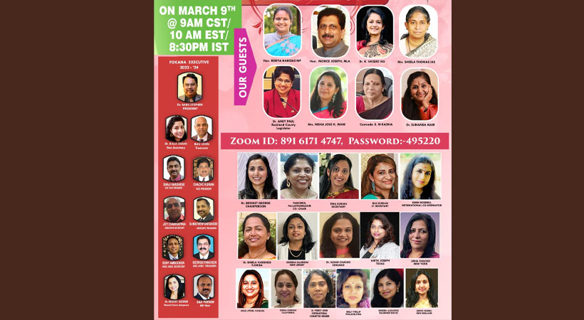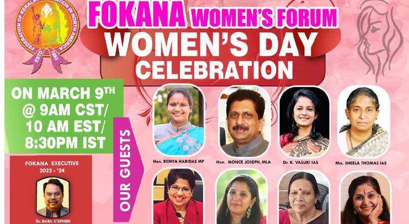 ന്യൂയോർക്ക്: രാജ്യാന്തര വനിതാ ദിനാഘോഷത്തോട് അനുബന്ധിച്ചു ഫൊക്കാന നടത്തുന്ന വിമെൻസ്ഡേ സെലിബ്രേഷൻസ് മാര്ച്ച് 9 ശനിയാഴ്ച രാവിലെ 10 മണിക്ക് സൂം മീറ്റിലൂടെ നടക്കും. ആലത്തൂർ എംപി രമ്യ ഹരിദാസ് മുഖ്യാതിഥി ആയിരിക്കും. മോൻസ് ജോസഫ് എംഎൽഎ, ഡോ. വാസുകി IAS, ഷീല തോമസ് IAS , ഡോ . ആനി പോൾ , നിഷ ജോസ് കെ മാണി , ഇ . എം . രാധ, ഡോ. സുനന്ദ നായർ എന്നിവർ പ്രസംഗിക്കും.