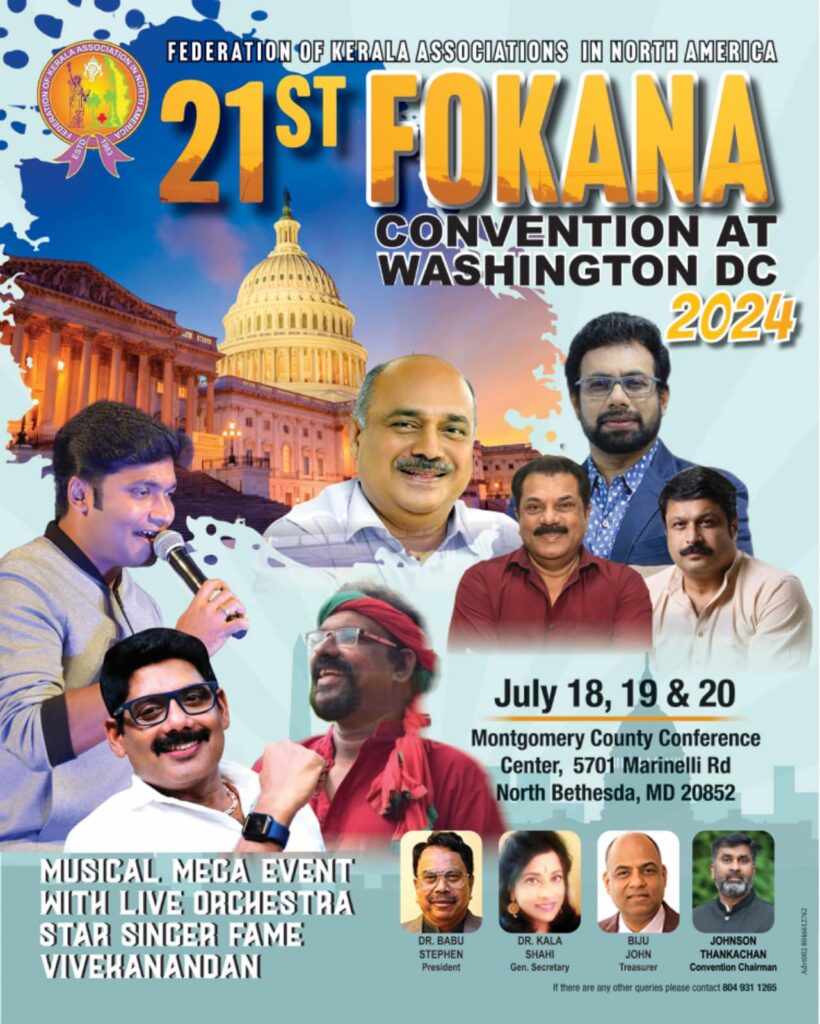 വാഷിംഗ്ടണ് ഡിസി: അമേരിക്കന് മലയാളികളുടെ ഏറ്റവും വലിയ കൂട്ടായ്മയായ ഫൊക്കാനയുടെ (ഫെഡറേഷന് ഓഫ് കേരള അസോസിയേഷന്സ് ഇന് അമേരിക്ക) ഇരുപത്തിയൊന്നാമത് ദേശീയ കണ്വെന്ഷന് ഇനി ഒരാഴ്ച മാത്രം. ജൂലായ് 18 മുതല് 20വരെ വാഷിംഗ്ടണ് ഡി.സിയിലെ നോർത്ത് ബെഥെസ്ഡയിലുള്ള മോണ്ട്ഗോമറി കൗണ്ടി കോൺഫറൻസ് സെന്ററിലാണ് (Bethesda North Marriott Hotel & Conference Center, 5701 Marinelli Rd, Rockville, MD 20852) മൂന്ന് ദിവസത്തെ ഫൊക്കാന കണ്വെന്ഷന്. കോണ്ഫറന്സിനുള്ള ഒരുക്കങ്ങൾ പൂർത്തിയായതായി പ്രസിഡന്റ് ഡോ.ബാബു സ്റ്റീഫനും, നാഷണൽ എക്സിക്യൂട്ടീവും, സംഘാടക സമിതിയും അറിയിച്ചു.