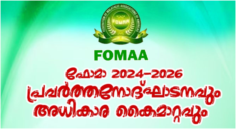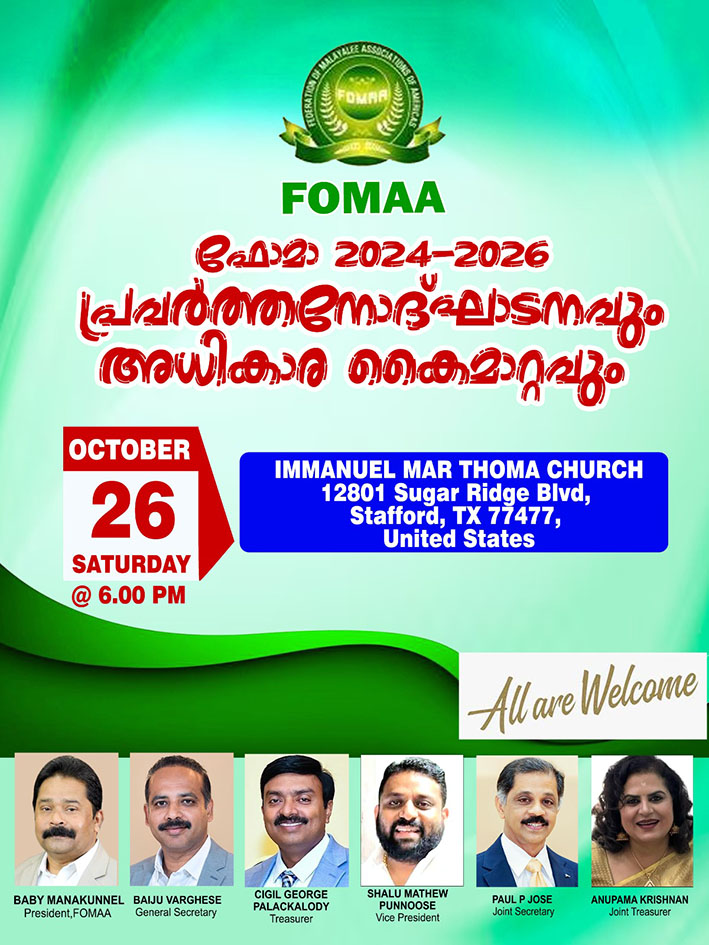 ഹൂസ്റ്റണ്: അമേരിക്കന് മലയാളി സംഘടനകളെ ഒരു കുടയുടെ തണലില് ഒരുമിപ്പിക്കുന്ന ഫോമായുടെ പുതിയ ഭരണസമിതിയുടെ 2024-’26 വര്ഷത്തേയ്ക്കുള്ള പ്രവര്ത്തനോദ്ഘാടനം വരുന്ന ഒക്ടോബര് 26-ാം തീയയി ശനിയാഴ്ച വൈകുന്നേരം 6 മണിക്ക് സ്റ്റാഫോര്ഡിലെ ഇമ്മാനുവേല് മാര്ത്തോമ്മാ സെന്ററില് (12801 Sugar Ridge Blvd, Stafford, TX 77477) വര്ണാഭമായ വിവിധ പരിപാടികളോടെ നടക്കുമെന്ന് പ്രസിഡന്റ് ബേബി മണക്കുന്നേല് അറിയിച്ചു.