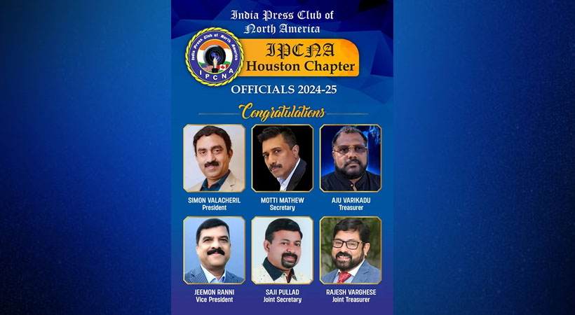 കൈരളി ടി.വി ഹൂസ്റ്റണ് ബ്യൂറോ ചീഫായ മോട്ടി മാത്യുവാണ് സെക്രട്ടറി. ട്രഷറര് ആയി അജു വാരിക്കാട് (പ്രവാസി ചാനല്), വൈസ് പ്രസിഡന്റ് ആയി ജീമോന് റാന്നി (ഫ്രീലാന്സ് ജേണലിസ്റ്റ് നേര്കാഴ്ച, ഇ മലയാളി), ജോയിന്റ് സെക്രട്ടറിയായി സജി പുല്ലാട് (ഏഷ്യാനെറ്റ് യു.എസ്.എ), ജോയിന്റ് ട്രഷററായി രാജേഷ് വര്ഗീസ് (നേര്കാഴ്ച ചെയര്മാന്-ആര്.വി.എസ് ഇന്ഷുറന്സ് ഗ്രൂപ്പ്) തുടങ്ങിയവരും തിരഞ്ഞെടുക്കപ്പെട്ടു. സ്റ്റാഫോര്ഡിലെ നേര്കാഴ്ച പത്രം ഓഫീസില് ഇന്ത്യ പ്രസ് ക്ലബ് ഓഫ് നോര്ത്ത് അമേരിക്കയുടെ നാഷണല് വൈസ് പ്രസിഡന്റ് അനില് ആറന്മുളയുടെ അധ്യക്ഷതയില് ചേര്ന്ന യോഗത്തിലായിരുന്നു പുതിയ ഭാരവാഹികളെ ഏകകണ്ഠമായി തിരഞ്ഞെടുത്തത്.
