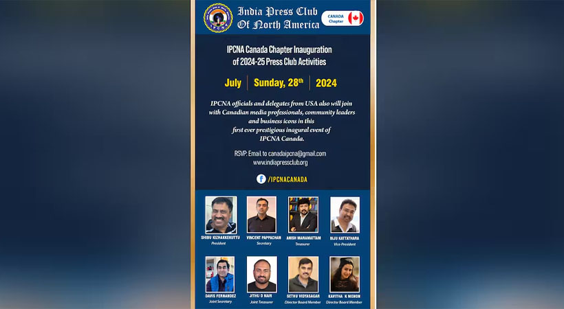 ഇന്ത്യന് പ്രസ് ക്ലബ്ബ് ഓഫ് നോര്ത്ത് അമേരിക്ക കാനഡ (ഐപിസിഎന്എ) ചാപ്റ്ററിന്റെ ഉദ്ഘാടനം ജൂലൈ 28 ന് വൈകുന്നേരം നടക്കുമെന്ന് സംഘാടകർ അറിയിച്ചു. ഐ.പി.സി.എന്.എ പ്രവര്ത്തകരുടെ നേതൃത്വത്തിലാണ് പരിപാടി നടക്കുക. ഐപിസിഎന്എയുടെ ദേശീയ അംഗങ്ങളും പരിപാടിയില് പങ്കെടുക്കും.