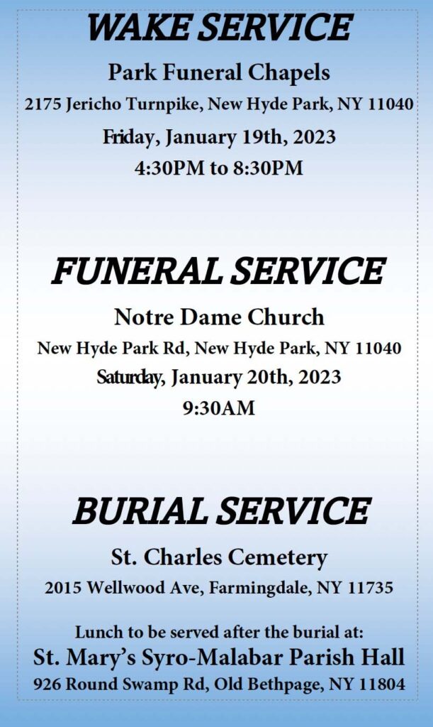 സംസ്കാര ശുശ്രുഷ: ജനുവരി 20 രാവിലെ 9:30: നോത്രെ ഡെം ചര്ച്ച്, ന്യു ഹൈഡ് പാര്ക്ക് റോഡ്, ന്യു യോര്ക്ക്-11040 സംസ്കാരം: സെന്റ് ചാള്സ് സെമിത്തേരി, 2015 വെല് വുഡ് അവന്യു, ഫാര്മിംഗ്ഡെയ്ല്, ന്യു യോര്ക്ക്-11735