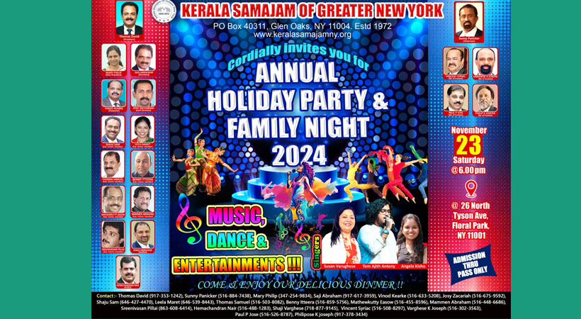ന്യൂയോർക്ക്: ന്യൂയോർക്കിലെ മലയാളികളുടെ സാംസ്കാരിക കൂട്ടായ്മയായ കേരളാ സമാജം ഓഫ് ഗ്രെയ്റ്റർ ന്യൂയോർക്ക് അമ്പത്തിരണ്ടാമത് വാർഷിക ഹോളിഡേ പാർട്ടിയും ഫാമിലി നൈറ്റും നവംബർ 23 ശനിയാഴ്ച വൈകിട്ട് 6 മണി മുതൽ അതിവിപുലമായി ആഘോഷിക്കുന്നു. കഴിഞ്ഞ അഞ്ചു പതിറ്റാണ്ടിലേറെയായി ഒത്തൊരുമയോടെ പ്രവർത്തിച്ചു വരുന്ന കേരളാ സമാജം കൂടുതൽ അംഗങ്ങളെയും സുഹൃത്തുക്കളെയും പങ്കെടുപ്പിച്ച് കൊണ്ട് ഫ്ലോറൽ പാർക്കിലുള്ള ടൈസൺ സെന്ററിൽ (Tyson Center, 26 N Tyson Ave, Floral Park, NY 11001) ഫാമിലി നൈറ്റ് നടത്തുന്നതിനുള്ള ഒരുക്കങ്ങൾ പൂർത്തിയായി. കേരളാ സമാജത്തിന്റെ ഈ വർഷം നടത്തപ്പെട്ട പരിപാടികളെല്ലാം കൂടുതൽ ജനപങ്കാളിത്തം കൊണ്ട് ശ്രദ്ധേയമായിരുന്നു.