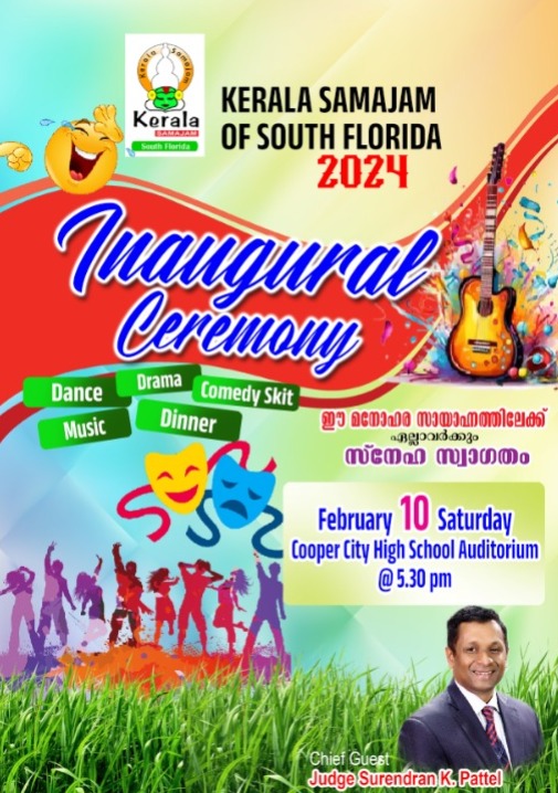മയാമി : കേരള സമാജം ഓഫ് സൗത്ത് ഫ്ലോറിഡയുടെ 2024 -ലെ പ്രവർത്തനോദ്ഘാടനം ഫെബ്രുവരി 10 ന് വൈകിട്ട് 5.30 നു കൂപ്പർ സിറ്റി ഹൈസ്കൂൾ ഓഡിറ്റോറിയത്തിൽ നടക്കും. 240 ഡിസ്ട്രിക്ട് കോർട്ട് ഓഫ് ടെക്സസ് ജഡ്ജ് സുരേന്ദ്രൻ കെ പട്ടേൽ മുഖ്യാതിഥി ആയിരിക്കും. ചടങ്ങിൽ ഒട്ടേറെ പ്രമുഖ വ്യക്തികൾ പങ്കെടുക്കും.