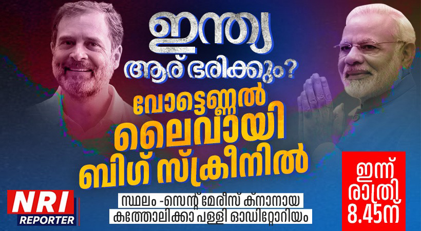 ചിക്കാഗോ പൗരസമിതിയുടെ നേതൃത്വത്തിലാണ് ഇന്ത്യയില് നടക്കുന്ന വോട്ടെണ്ണല് തല്സമയം കാണാന് മലയാളികള് ഒത്തുകൂടുന്നത്. ചിക്കാഗോ സെന്റ് മേരീസ് കത്തോലിക്കാ പള്ളി ഓഡിറ്റോറിയത്തില് ഇന്ന് രാത്രി 8.45 മുതല് ബിഗ് സ്ക്രീനില് ഫലപ്രഖ്യാപനം കാണാം. പരിപാടിയിലേക്ക് എല്ലാ മലയാളികളെയും പൗരസമിതി സ്വാഗതം ചെയ്തു. പരിപാടി സംബന്ധിച്ച വിശദ വിവരങ്ങള് അറിയാന് സംഘാടകനായ പീറ്റര് കുളങ്ങരയുമായി 847 951 4476 എന്ന നമ്പരില് സംസാരിക്കാവുന്നതാണ്.