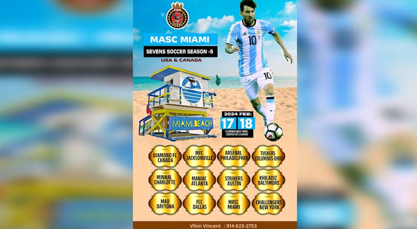 മാസ്ക് ( MASC) മയാമി എവർറോളിങ് ട്രോഫി സെവൻസ് ഫുട്ബോൾ ടൂർണമെൻ്റ് സീസൺ – 5 ഇന്നും നാളെയും ഫ്ലെമിങ്ഗോ വെസ്റ്റ് പാർക് കൂപ്പർസിറ്റിയിൽ വച്ച് നടക്കും. യുഎസിൻ്റേയും കാനഡയുടേയും വിവിധ ഭാഗങ്ങളിൽ നിന്നുള്ള 16 ടീമുകൾ ടൂർണമെന്റിൽ മാറ്റുരയ്ക്കുന്നു. മത്സരങ്ങൾ മുൻ ബ്രോവാർഡ് കൗണ്ടി മേയർ ഡെയ്ൽ ഹോൾനെസ് ഉദ്ഘാടനം ചെയ്യും.