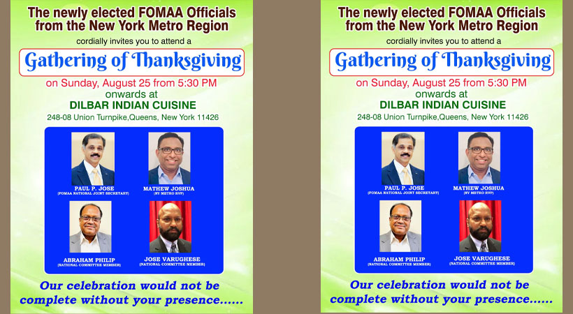 ന്യൂയോർക്ക്: ഡൊമിനിക്കൻ റിപ്പബ്ലിക്കിലെ പുന്റ കാനായിൽ നടന്ന ഫോമാ തെരഞ്ഞെടുപ്പിൽ ന്യൂയോർക്ക് മെട്രോ റീജനിൽ നിന്നും വിജയികളായവരെ അനുമോദിക്കുന്നതിനായി മെട്രോ റീജണിലെ പത്ത് അംഗ സംഘടനകൾ ഒത്തു ചേരുന്നു. 25-ന് ഞായറാഴ്ച വൈകിട്ട് 5:30-ന് ഫ്ലോറൽപാർക്കിലുള്ള ദിൽ ബാർ റെസ്റ്റോറന്റിലാണ് അനുമോദന യോഗം.