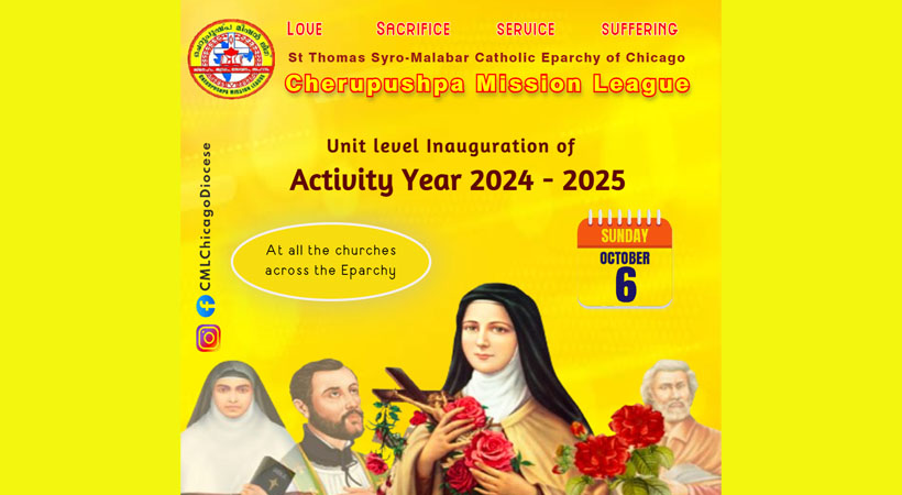 ചിക്കാഗോ: ചെറുപുഷ്പ മിഷൻ ലീഗിന്റെ 2024 – 2025 പ്രവർത്തനവർഷത്തിന്റെ യുണിറ്റ് തലത്തിലുള്ള ഉദ്ഘാടനം ഒക്ടോബർ 6ന് നടക്കും. ചിക്കാഗോ രൂപതയുടെ കീഴിലുള്ള എല്ലാ ഇടവകകളിലും മിഷനുകളിലും മിഷൻ ലീഗിന്റെ ഈ വർഷത്തെ പ്രവർത്തനങ്ങൾക്ക് അന്നേദിവസം തുടക്കമാവും. മിഷൻ ലീഗ് പതാക ഉയർത്തൽ, വിശുദ്ധ കുർബാന, അംഗത്വ നവീകരണം, പുതിയ ഭാരവാഹികളുടെ സ്ഥാനാരോഹണം, ക്ളാസ്സുകൾ തുടങ്ങിയ വിവിധ പരിപാടികൾ ഇടവക തലത്തിൽ സംഘടിപ്പിക്കും. ഇടവക വികാരിമാരും മിഷൻ ലീഗ് കോർഡിനേറ്റർമാരും പരിപാടികൾക്ക് നേതൃത്വം നൽകും.