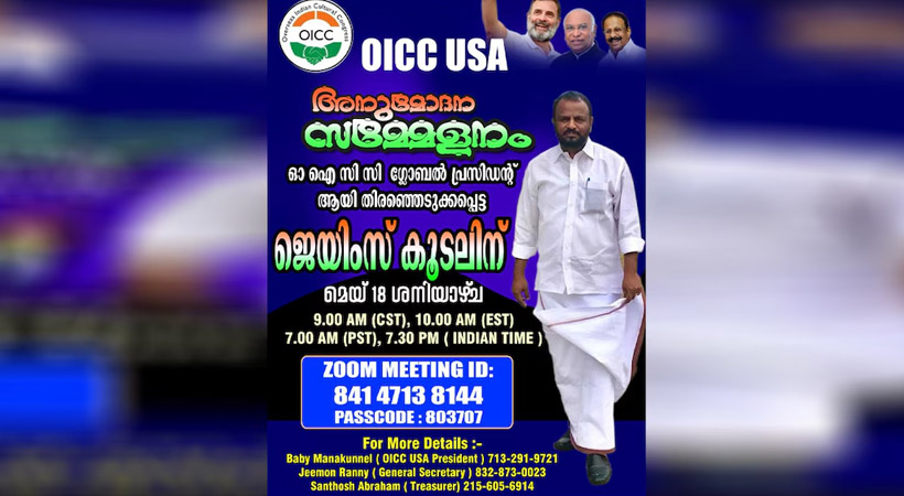 ഹൂസ്റ്റൺ: ഒഐസിസിയുടെ ഗ്ലോബൽ പ്രസിഡന്റായി നിയമിക്കപ്പെട്ട ഓവർസീസ് ഇന്ത്യൻ കൾച്ചറൽ കോൺഗ്രസ് യുഎസ്എ ദേശീയ ചെയർമാൻ ജെയിംസ് കൂടലിനെ അനുമോദിക്കുന്നതിനായി പ്രത്യേകം യോഗം ചേരുന്നു. ശനിയാഴ്ച (മേയ് 18) രാവിലെ ഹൂസ്റ്റൺ സമയം രാവിലെ 9 ന് ജെയിംസിനെ അഭിനന്ദിക്കാൻ സൂം മീറ്റിങ് ക്രമീകരിക്കുന്നു. എല്ലാ ഒഐസിസി യുഎസ്എ അംഗങ്ങളും അഭ്യുദയകാംക്ഷികളും യോഗത്തിൽ പങ്കെടുക്കണമെന്ന് ഭാരവാഹികൾ അറിയിച്ചു. മീറ്റിങ് ഐഡി 841 4713 8144 ,പാസ്സ്കോഡ് 803707.
