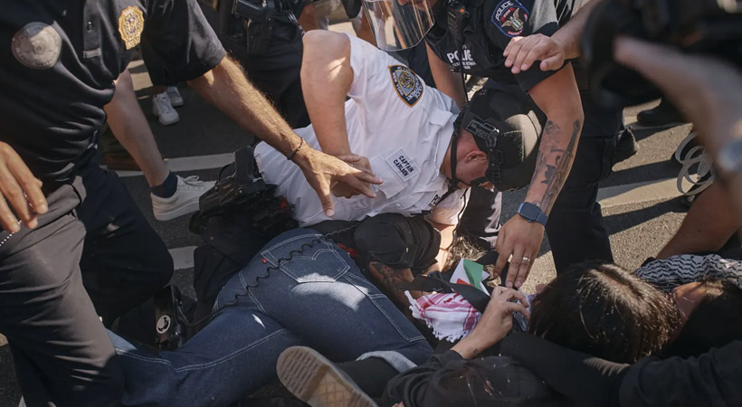 ന്യൂയോർക്ക് സിറ്റി പോലീസ് ഉദ്യോഗസ്ഥർ മ്യൂസിയത്തിന് പുറത്ത് ജനക്കൂട്ടത്തിനിടയിൽ ഉണ്ടായ സംഘർഷത്തിനിടെ ചില പ്രതിഷേധക്കാരെ നേരിടുകയും മർദ്ദിക്കുകയും ചെയ്തു. ചില പ്രകടനക്കാർ ഓഫീസർമാർക്ക് നേരെ പ്ലാസ്റ്റിക് കുപ്പികൾ എറിയുകയും അസഭ്യം പറയുകയും ചെയ്തു. മറ്റ് പ്രതിഷേധക്കാർ ബാനറുകൾ പിടിച്ച്, പലസ്തീൻ പതാകകൾ വീശിക്കൊണ്ട് നഗരത്തിലെ രണ്ടാമത്തെ വലിയ ബ്യൂക്സ് ആർട്സ് മ്യൂസിയത്തിൻ്റെ പടികളിൽ നിന്നു ഉറക്കെ മുദ്രാവാക്യം വിളിച്ചു.