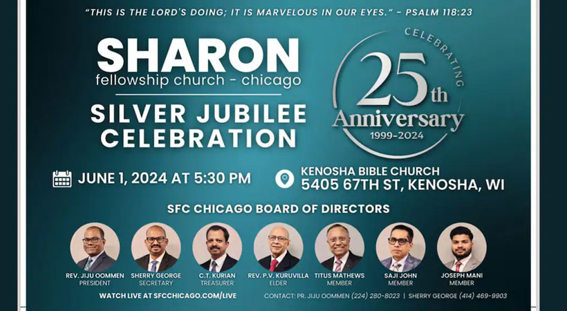 ഷിക്കാഗോയിൽ ശാരോൻ ഫെല്ലോഷിപ്പ് ചർച്ചിന്റെ പ്രവർത്തനം ആരംഭിച്ചിട്ട് 25 വർഷം പൂർത്തിയാക്കുന്നതിന്റെ ഭാഗമായി പ്രത്യേക സ്തോത്ര ശുശ്രൂഷ സമ്മേളനം ജൂൺ 1 ന് വൈകിട്ട് അഞ്ചര മണിക്ക് നടക്കും. ഈ സമ്മേളനത്തിൽ കെനോഷാ സിറ്റി മേയർ ഡേവിഡ് ബോഗ്ഡോള ഉൾപ്പെടെയുള്ള വിശിഷ്ട അതിഥികൾ പങ്കെടുക്കും. സിൽവർ ജൂബിലി തീം സോങ് ക്വയർ അവതരിപ്പിക്കും. സഭയുടെ ചരിത്രം അടങ്ങിയ സുവനീർ ഈ സമ്മേളനത്തിൽ പ്രകാശനം ചെയ്യും. റവ. ജിജു ഉമ്മൻ (പ്രസിഡന്റ് ), ഷെറി കെ. ജോർജ് (സെക്രട്ടറി), ജെയിംസ് ഉമ്മൻ (പ്രോഗ്രാം കോർഡിനേറ്റർ) എന്നിവരുടെയും ചർച്ച് ബോർഡിന്റെയും നേതൃത്വത്തിൽ വിവിധ കമ്മിറ്റികൾ സമ്മേളനത്തിന്റെ സുഗമമായ നടത്തിപ്പിനായി പ്രവർത്തിച്ചു വരുന്നു.