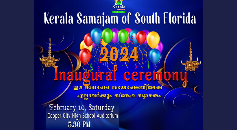സൗത്ത് ഫ്ലോറിഡ കേരള സമാജത്തിന്റെ 2024 വർഷത്തെ പ്രവർത്തനങ്ങളുടെ ഉദ്ഘാടനം ഫെബ്രുവരി 10ന് കൂപ്പർ സിറ്റി ഹൈസ്കൂൾ ഓഡിറ്റോറിയത്തിൽ വൈകിട്ട് 5.30 ന് നടക്കും . ജഡ്ജ് സുരേന്ദ്രൻ കെ പട്ടേൽ മുഖ്യാതിഥി ആയിരിക്കും . നൃത്തവും സംഗീതവും ഉൾപ്പെടെ കലാ പരിപാടികളും ഡിന്നറും ഉണ്ടായിരിക്കും.