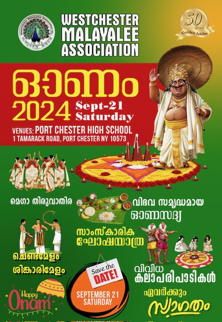 ഓണഘോഷം വിജയപ്രദമാക്കുവാന് വെസ്റ്റ്ചെസ്റ്റര് , ന്യൂയോർക്ക് നിവാസികളായ എല്ലാ മലയാളി സഹോദരങ്ങളുടെയുംസഹായ സഹകരണങ്ങള് അഭ്യർഥിക്കുന്നതായി പ്രസിഡന്റ് വർഗീസ് എം കുര്യൻ (ബോബൻ ) , സെക്രട്ടറി: ഷോളി കുമ്പിളിവേലി ,ട്രഷറര് : ചാക്കോ പി ജോർജ് (അനി) , വൈസ് പ്രസിഡന്റ് ജോയി ഇട്ടൻ ,ജോ. സെക്രട്ടറി : നിരീഷ് ഉമ്മൻ , ജോയിന്റ് ട്രഷർ അലക്സാണ്ടർ വർഗീസ് ട്രസ്റ്റി ബോര്ഡ് ചെയര് രാജ് തോമസ് , കോർഡിനേറ്റേഴ്സ് ആയ ടെറൻസൺ തോമസ് , ശ്രീകുമാർ ഉണ്ണിത്താൻ എന്നിവര് അറിയിച്ചു.