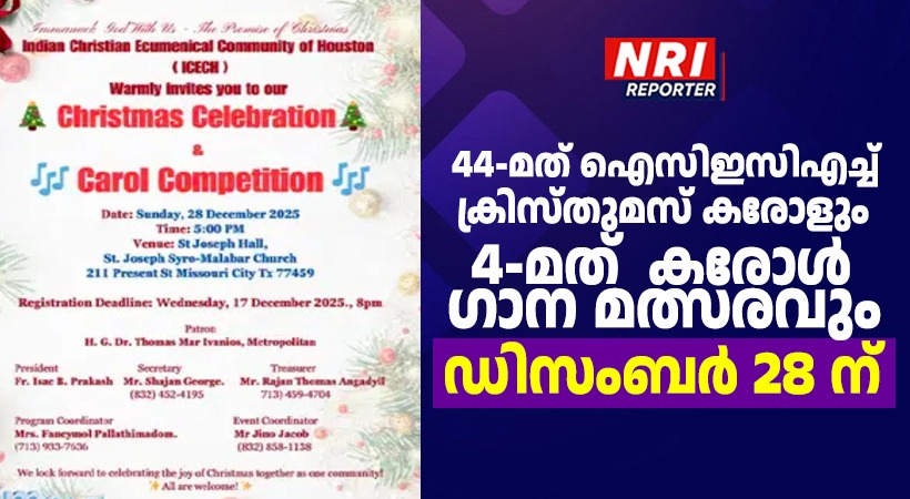 ഹൂസ്റ്റൺ : ഇന്ത്യൻ ക്രിസ്ത്യൻ എക്യൂമിനിക്കൽ കമ്മ്യൂണിറ്റി ഓഫ് ഹുസ്റ്റന്റെ (ICECH) ആഭിമുഖ്യത്തിൽ എല്ലാ വർഷവും നടത്തി വരുന്ന ക്രിസ്മസ് കരോളും കരോൾ ഗാനമത്സരവും ഈ വർഷം ഡിസംബർ 28 ന് വൈകിട്ട് അഞ്ച് മണിക്ക് ഹൂസ്റ്റൺ സെന്റ്. ജോസഫ് സീറോ മലബാർ ചർച്ച് ഹാളിൽ വെച്ചു നടത്തപ്പെടുന്നു. ഹൂസ്റ്റനിലെ 20 പള്ളികൾ ചേർന്നുള്ള ഈ പരിപാടി വിപുലമായ കമ്മറ്റിയുടെ നേതൃത്വത്തിൽ നടത്തുന്നു.