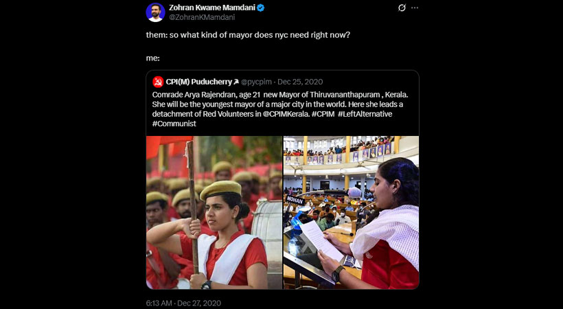 2020ല് രാജ്യത്തെ ഏറ്റവും പ്രായം കുറഞ്ഞ മേയറായ 21കാരി ആര്യ രാജേന്ദ്രനെ പരാമര്ശിച്ച പോസ്റ്റാണ് മംദാനിയിലൂടെ വീണ്ടും ചര്ച്ചയാകുന്നത്. തിരുവനന്തപുരം മേയറായി ആര്യാ രാജേന്ദ്രന് തിരഞ്ഞെടുക്കപ്പെട്ട വാര്ത്ത ‘ഇങ്ങനെയൊരു മേയര് ന്യൂയോര്ക്കിനും വേണ്ടേ’ എന്ന് ചോദിച്ചുകൊണ്ട് മംദാനി ഷെയര് ചെയ്തിരുന്നു. 2020-ല്, ന്യൂയോര്ക്ക് സിറ്റി മേയര് എങ്ങനെയായിരിക്കണമെന്ന് പറയാന് സിപിഐ എം പുതുച്ചേരിയില് നിന്നുള്ള ഒരു പോസ്റ്റാണ് അദ്ദേഹം പങ്കിട്ടത്. ‘സഖാവ് ആര്യ രാജേന്ദ്രന്, വയസ്സ് 21, കേരളത്തിലെ തിരുവനന്തപുരത്തിന്റെ പുതിയ മേയര്. ലോകത്തിലെ ഒരു പ്രധാന നഗരത്തിലെ ഏറ്റവും പ്രായം കുറഞ്ഞ മേയറായിരിക്കും അവര്,’ സിപിഎം ഹാന്ഡില് 2020 ഡിസംബറില് വന്ന ഈ പോസ്റ്റാണ് മംദാനി ഷെയര് ചെയ്തത്.