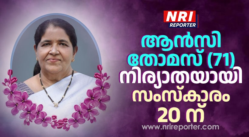 നീണ്ടൂർ: നീണ്ടൂർ വെട്ടിക്കാട്ട് തൊമ്മിക്കുഞ്ഞിൻ്റെ ഭാര്യ ആൻസി തോമസ് (71) അന്തരിച്ചു. പരേത കണ്ണങ്കര കൂപ്ലിക്കാട്ട് കുടുംബാംഗമാണ്.