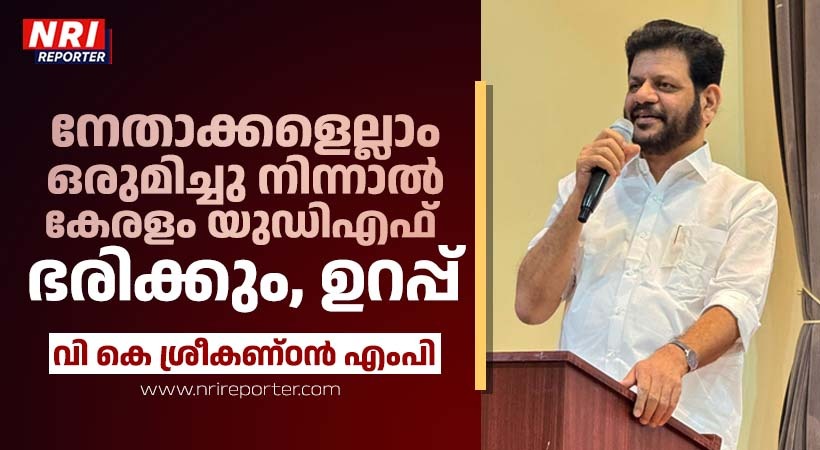 ഷിക്കാഗോ: കേരളത്തിലെ കോൺഗ്രസ് നേതാക്കൾ അഭിപ്രായ ഭിന്നതയും അനൈക്യവും മറന്ന് ഒന്നിച്ചു നിന്നാൽ അടുത്ത അസംബ്ലി തിരഞ്ഞെടുപ്പിൽ ഉറപ്പായും യുഡിഎഫ് കേരളത്തിൽ അധികാരത്തിൽ എത്തുമെന്ന് പാലക്കാട് എംപി വി. കെ ശ്രീകണ്ഠൻ.