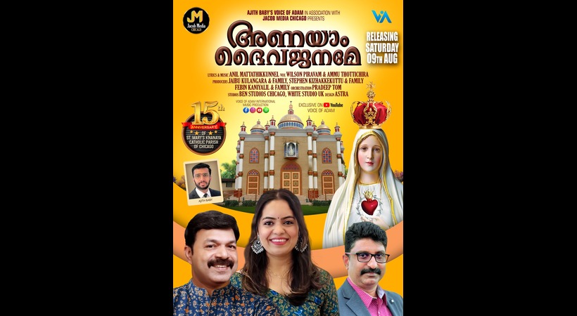 ചിക്കാഗോ: ചിക്കാഗോ സെന്റ് മേരീസ് ക്നാനായ കത്തോലിക്കാ ഇടവകയുടെ പതിനഞ്ചാമത് വാർഷികാഘോഷങ്ങളുടെ ഭാഗമായി പുറത്തിറക്കുന്ന ക്രിസ്തീയ ഭക്തിഗാന ആൽബത്തിലെ പ്രഥമ ഗാനം ‘അണയാം ദൈവജനമേ’ ഓഗസ്റ്റ് ഒമ്പതിന് (ശനി) പ്രകാശനം ചെയ്യുന്നു. വൈകിട്ട് 7 :30 ന് നടത്തപ്പെടുന്ന കലാ സന്ധ്യയിൽ വച്ച് ഇടവക വികാരി ഫാ. സിജു മുടക്കോടിൽ ഗാനം പ്രകാശനം ചെയ്യും.
