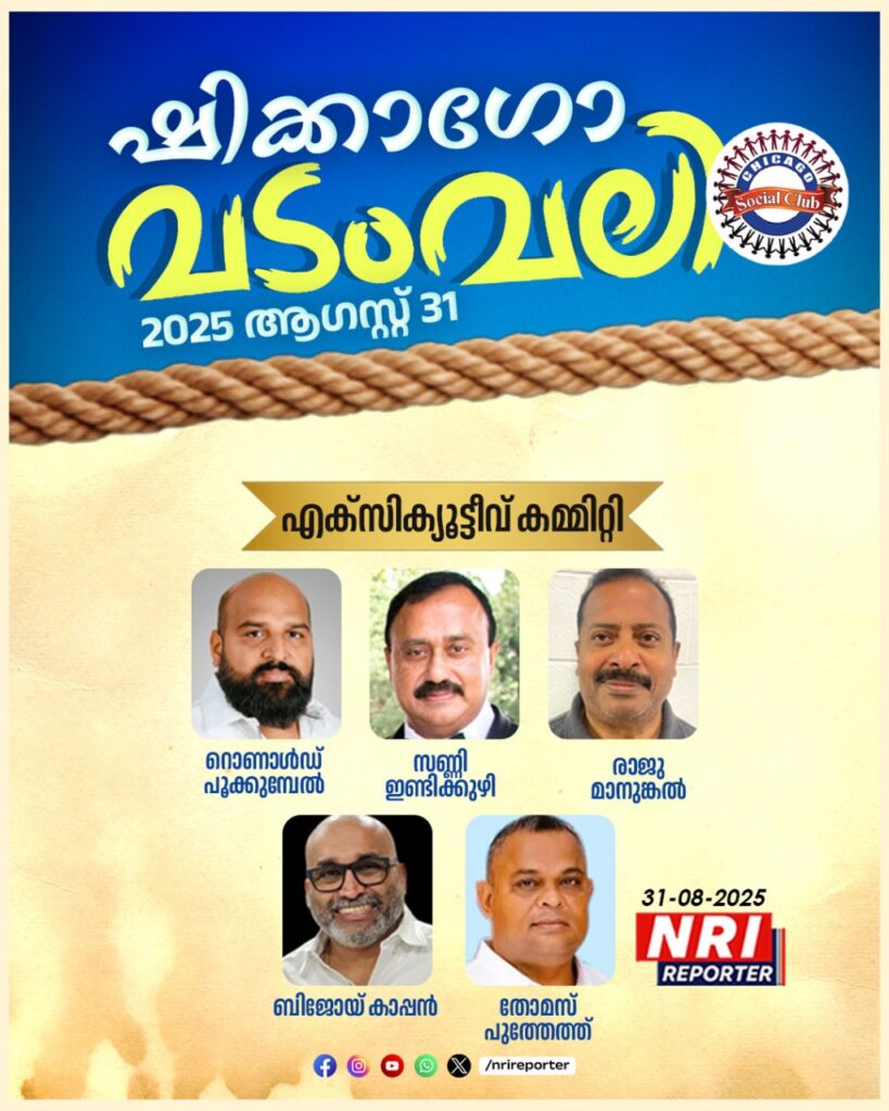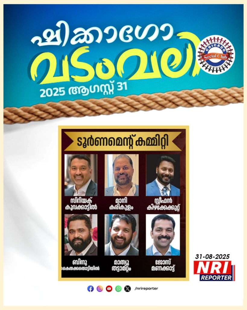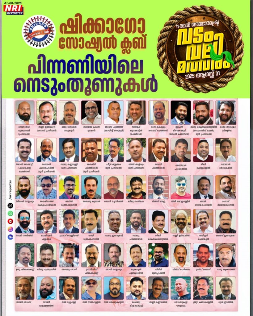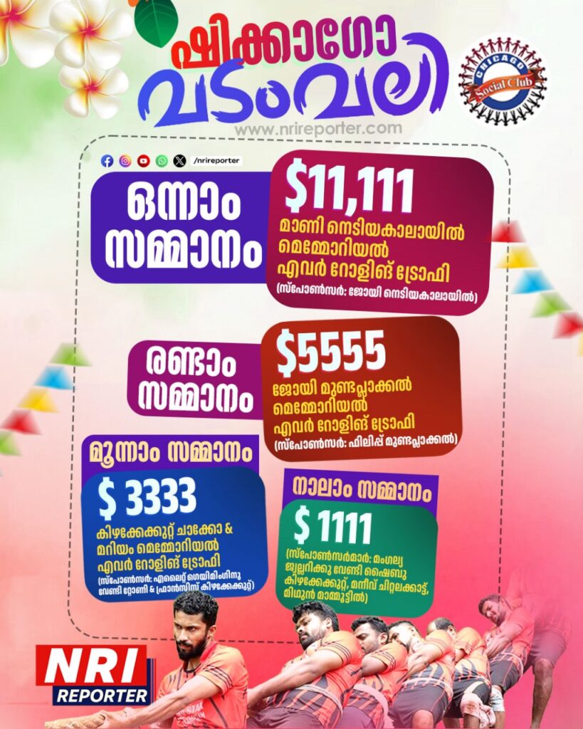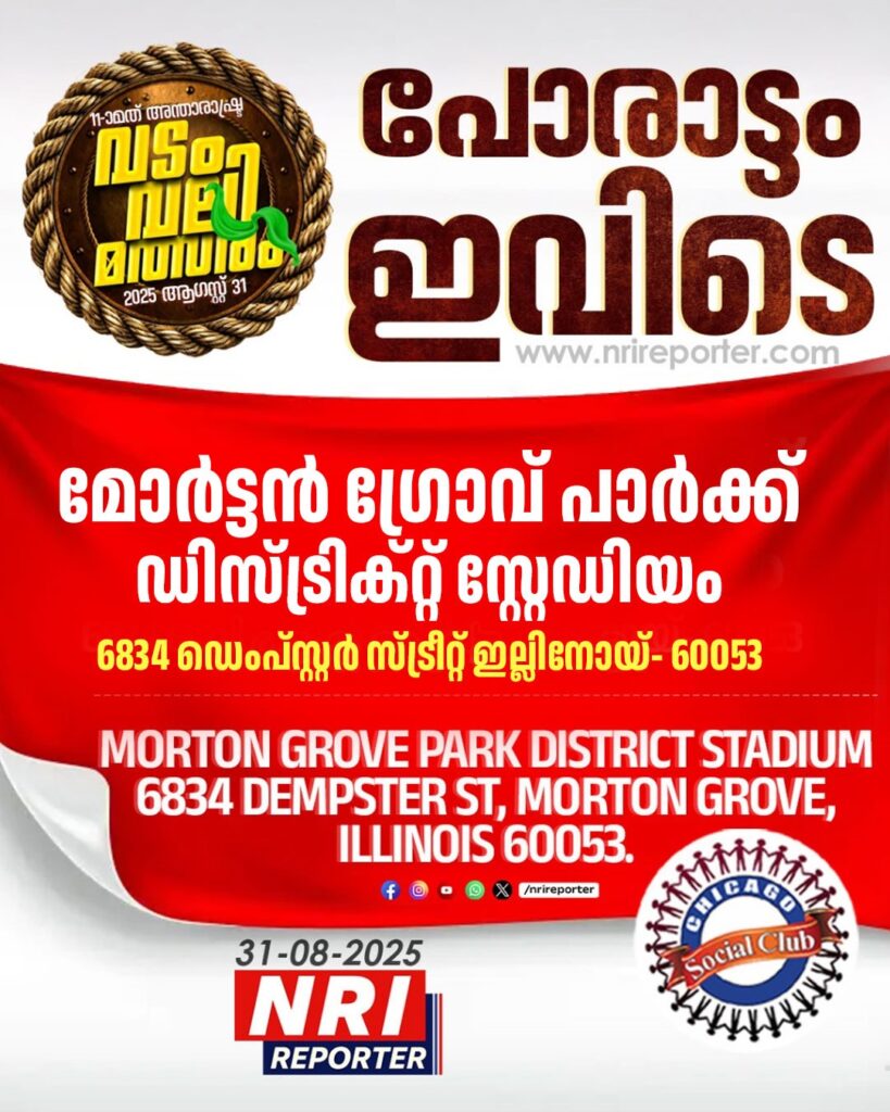 കൈക്കരുത്തും മനക്കരുത്തും ഒന്നിക്കുന്ന വടംവലിയുടെ ലോകകപ്പ് പോരാട്ടത്തിന് ഷിക്കാഗോയുടെ ചരിത്ര പ്രസിദ്ധമായ മണ്ണ് ഒരുങ്ങി. ലോക വടംവലി പ്രേമികളുടെ എല്ലാ വഴികളും ഇന്ന് ഷിക്കാഗോയിലേക്ക്. മോര്ട്ടന് ഗ്രോവ് പാര്ക് ഡിസ്ട്രിക്ട് സ്റ്റേഡിയത്തില് കാരിരുമ്പിന്റെ കരുത്തുമായി 22 വടം വലി ടീമുകള് നേര്ക്കുനേര് ഏറ്റു മുട്ടുമ്പോള്, ആവേശം ആകാശത്തോളമാകും. ആരായിരിക്കും ആ കരുത്തന്മാര്? ആരായിരിക്കും ബുദ്ധിയും ശക്തിയും ഒരുപോലെ കമ്പക്കയറില് കോര്ത്തുചേര്ത്ത് കപ്പടിക്കുന്ന ആ മിടുക്കന്മാര്? ഷിക്കാഗോ സോഷ്യല് ക്ലബിന്റെ ചരിത്രത്തിൽ സ്വര്ണ ലിപികളില് എഴുതിച്ചേര്ക്കപ്പെടുന്ന ചരിത്രമാണ് ഇന്ന് ഇവിടെ രചിക്കാന് പോകുന്നത്. ആ അത്യപൂര്വ്വ ആവേശ നിമിഷങ്ങളിക്ക് എല്ലാ മലയാളികളെയും ഷിക്കാഗോയിലേക്ക് സ്വാഗതം ചെയ്യുകയാണ്. ഷിക്കാഗോ മോര്ട്ടന് ഗ്രോവ് പാര്ക്ക് ഡിസ്ട്രിക്റ്റ് സ്റ്റേഡിയത്തിലാണ് (6834 ഡെംപ്സ്റ്റര് സ്ട്രീറ്റ് ഇല്ലിനോയ്- 60053) വടംവലി പോരാട്ടം നടക്കുന്നത്.