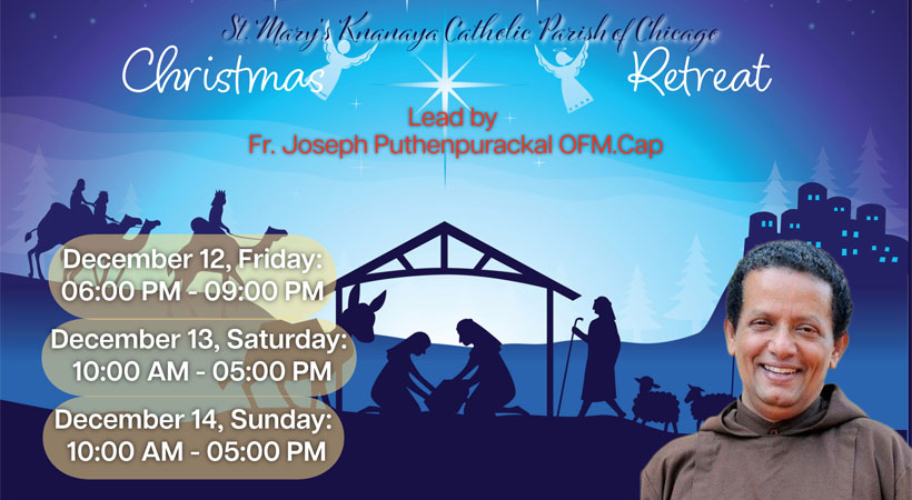 ചിക്കാഗോ: ചിക്കാഗോ സെന്റ് മേരീസ് ക്നാനായ കത്തോലിക്കാ ഇടവകയിൽ ക്രിസ്തുമസിനൊരുക്കമായുള്ള ധ്യാനത്തിന് പ്രശസ്ത വാഗ്മിയും കപ്പൂച്ചിൻ സഭാംഗവുമായ ഫാ. ജോസഫ് പുത്തൻപുരക്കൽ നേതൃത്വം നൽകും. നർമ്മത്തിൽ ചാലിച്ച പ്രഭാക്ഷണങ്ങളിലൂടെ ജനഹൃദയം കീഴടക്കി, കാപ്പിപ്പൊടിയാച്ചൻ എന്ന പേരിൽ പ്രസിദ്ധനായ ജോസഫച്ചൻ നേതൃത്വം നിലക്കുന്ന ധ്യാനം ആരംഭിക്കുന്നത്, ഡിസംബർ 12 വെള്ളിയാഴ്ച വൈകിട്ട് 6 മണിക്കുള്ള ദിവ്യബലിയോടെയാണ്. ദിവ്യബലിയെ തുടർന്ന് 9 മണി വരെ ധ്യാന പ്രസംഗം ഉണ്ടായിരിക്കും. ശനിയാഴ്ച രാവിലെ പത്തുമണിക്കുള്ള ദിവ്യബലിയോടെ ആരംഭിച്ച് വൈകിട്ട് 5 മണിയോടെ അവസാനിക്കത്തക്കവിധത്തിലാണ് ധ്യാനം ക്രമീകരിച്ചിരിക്കുന്നത്. ഞായറാഴ്ച്ച രാവിലെ പത്തുമണിക്കുള്ള ദിവ്യബലിയോടെ ആരംഭിച്ച് വൈകുന്നേരം അഞ്ചുമണിക്ക് ധ്യാനം സമാപിക്കും. കുബസാരിക്കുവാനുള്ള അവസരം ധ്യാനത്തിന്റെ വിവിധ ദിനങ്ങളിൽ ഉണ്ടായിരിക്കും.