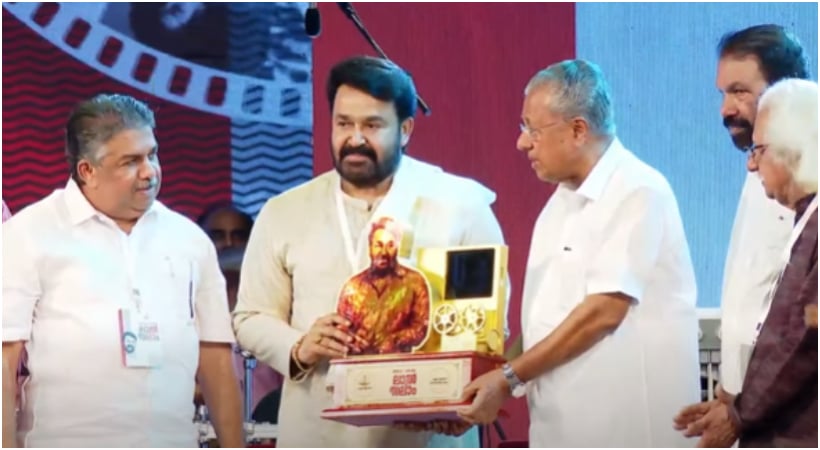 മലയാള ചലച്ചിത്ര വ്യവസായത്തിന്റെ നെടുംതൂണാണ് മോഹൻലാലെന്നും പിണറായി പറഞ്ഞു. ശതാബ്ദിയോട് അടുക്കുന്ന മലയാള സിനിമയുടെ ചരിത്രത്തിൽ അദ്ദേഹത്തിന്റെ സംഭാവനകൾ അനന്യമാണ്. ഒരേ സമയം മികച്ച നടനും ജനപ്രിയ താരവുമായി തിളങ്ങുന്ന മോഹൻലാൽ, മലയാളിയുടെ നിത്യജീവിതത്തിൽ ഒരു ശീലമായി മാറിയിരിക്കുന്നു. ഈ പുരസ്കാരം മലയാള സിനിമയുടെ സാംസ്കാരിക മൂല്യവും അന്താരാഷ്ട്ര തലത്തിലുള്ള അംഗീകാരവും ഉയർത്തിക്കാട്ടുന്നുവെന്നും മുഖ്യമന്ത്രി കൂട്ടിച്ചേർത്തു. ഓരോ മലയാളിക്കും അഭിമാനിക്കാവുന്ന നേട്ടമാണ് ഇത്. നിത്യജീവിതത്തിൽ മോഹൻലാലായി പോവുക എന്നത് മലയാളിയുടെ ശീലമായി. മോഹൻലാൽ മലയാളിയുടെ അപര വ്യക്തിത്വമെന്നും മുഖ്യമന്ത്രി വിവരിച്ചു. മോഹൻ ലാലിനെ പൊന്നാട അണിയിച്ച മുഖ്യമന്ത്രി, ശിൽപവും കാവ്യപത്രവും സമർപ്പിക്കുകയും ചെയ്തു.