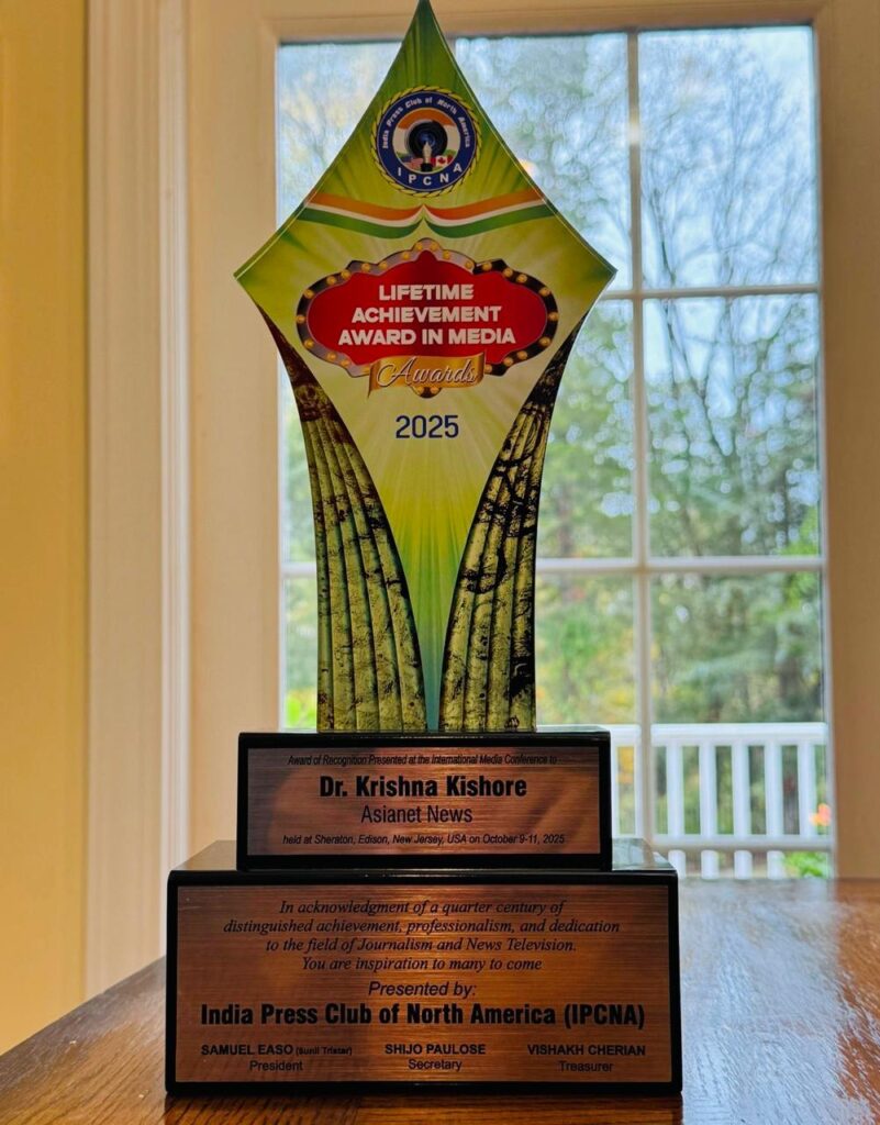കൃഷ്ണ കിഷോര്, ഏഷ്യാനെറ്റ് ന്യൂസ്, വാഷിംഗ്ടണ്…… കഴിഞ്ഞ രണ്ട് പതിറ്റാണ്ടോളം കാലമായി അമേരിക്കയില് നിന്ന് മലയാളികള് കേള്ക്കുന്ന സൈനിംഗ് ഓഫാണ് ഇത്. അമേരിക്കന് വാര്ത്തകളിലൂടെയും പ്രതിവാര പരിപാടികളിലൂടെയും മലയാളികള്ക്ക് എന്നും സുപരിചിതനാണ് ഡോ. കൃഷ്ണ കിഷോര്. അങ്ങനെ വാര്ത്തകളുമായി അമേരിക്കയില് നിന്ന് ലോകത്താകെയുള്ള മലയാളികള്ക്കൊപ്പം സഞ്ചരിക്കുന്ന കൃഷ്ണ കിഷോറിനായിരുന്നു ഇത്തവണത്തെ ഇന്ത്യ പ്രസ് ക്ളബ് ഓഫ് നോര്ത്ത് അമേരിക്കയുടെ ലൈഫ് ടൈം അച്ചീവ്മെന്റ് അവാര്ഡ്. ന്യൂജേഴ്സിയില് നടന്ന അന്താരാഷ്ട്ര മീഡിയ സെമിനാറില് ആ പുരസ്കാരം നല്കി കൃഷ്ണ കിഷോറിനെ ഇന്ത്യാ പ്രസ് ക്ളബ് ഓഫ് നോര്ത്ത് അമേരിക്ക ആദരിച്ചു.