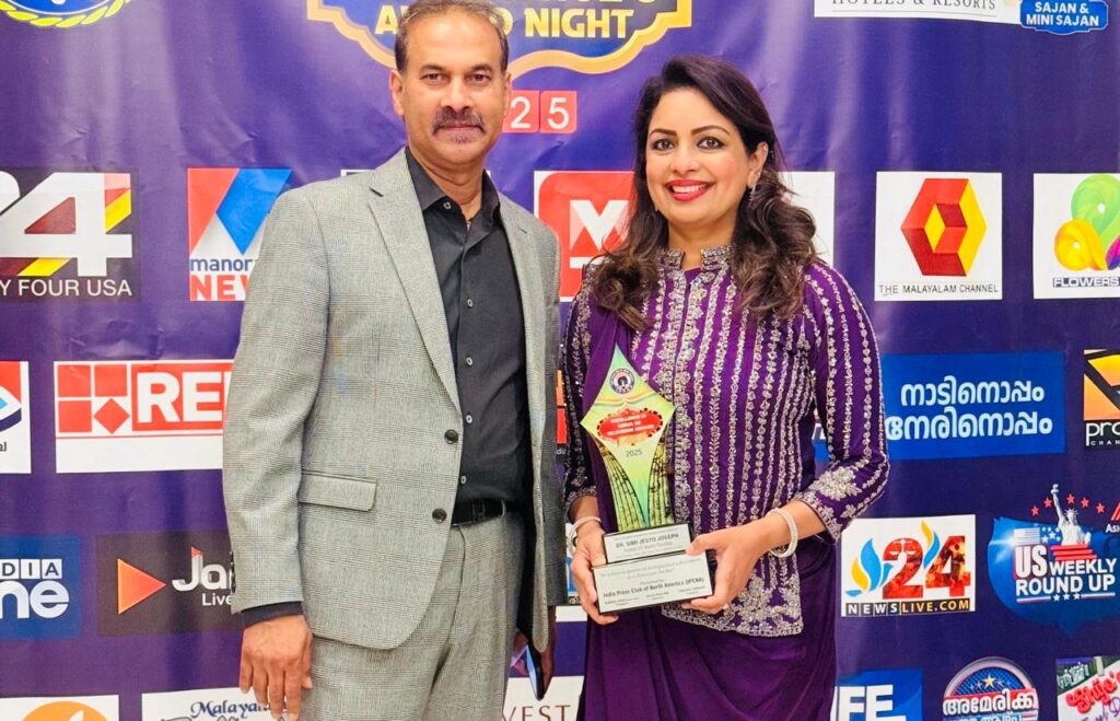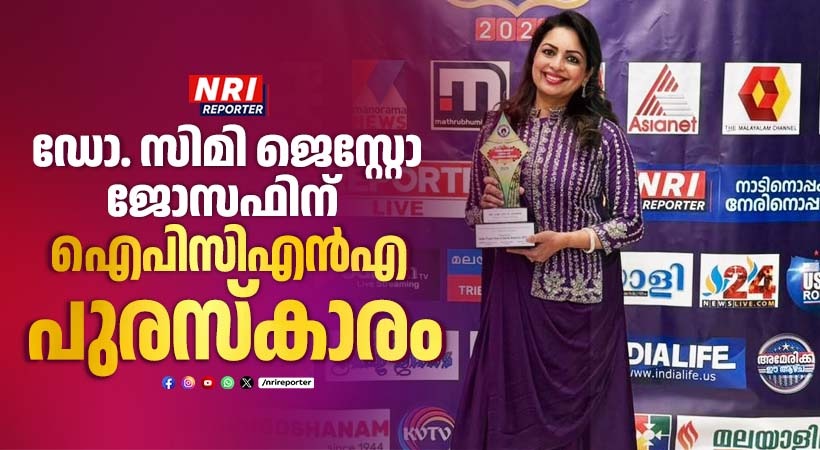 അമേരിക്കയിലെ മലയാള മാധ്യമ രംഗത്ത് ടെലിവിഷന് അവതരണ മികവുകൊണ്ട് ശ്രദ്ധിക്കപ്പെട്ട വനിതാ മുഖമാണ് ഡോ. സിമി ജെസ്റ്റോ ജോസഫ്. ഒരു പതിറ്റാണ്ടിന്റെ അനുഭവ സമ്പത്തുമായി മലയാളികള്ക്ക് സുപരിചിതയാണ് സിമി ജെസ്റ്റോ. ഏഷ്യാനെറ്റിലെ വീക്കിലി റൗണ്ടപ്പിന്റെ അവതാരകയായി എന്നും സിമി മലയാളികള്ക്ക് മുന്നിലുണ്ടായിരുന്നു. ഇതുവരെ 400 എപ്പിസോഡുകള് സിമിയുടെ അവതരണത്തിലൂടെയാണ് മലയാളികള് കണ്ടത്. മാധ്യമരംഗത്തെ പ്രവര്ത്തന മികവ് പരിഗണിച്ചാണ് ഇത്തവണ ഇന്ത്യാ പ്രസ് ക്ളബ് ഓഫ് നോര്ത്ത് അമേരിക്കയുടെ പുരസ്കാരം സിമി ജെസ്റ്റോവിനെ തേടി എത്തിയത്. ന്യൂജേഴ്സി അന്താരാഷ്ട്ര മീഡിയ സെമിനാറിന്റെ സമാപന സമ്മേളനത്തില് കേരളത്തില് നിന്നെത്തിയ പാര്ലമെന്റ് അംഗം എന്.കെ.പ്രേമചന്ദ്രന് എം.പിയില് നിന്ന് സിമി ജെസ്റ്റോ 2025ലെ മീഡിയ എക്സലന്സ് അവാര്ഡ് ഏറ്റുവാങ്ങി. വി.കെ.ശ്രീകണ്ഠന് എം.പി, പ്രമോദ് നാരായണൻ എംഎൽഎ, മുതിര്ന്ന മാധ്യമ പ്രവര്ത്തകനായ ജോണി ലൂക്കോസ്, ഇന്ത്യാ പ്രസ് ക്ളബ് ഓഫ് നോര്ത്ത് അമേരിക്ക പ്രസിഡന്റ് സുനിൽ ട്രൈസ്റ്റാർ, സെക്രട്ടറി ഷിജോ പൗലോസ് ഉള്പ്പടെയുള്ളവരുടെ സാന്നിധ്യത്തിലായിരുന്നു സിമി ജെസ്റ്റോ പുരസ്കാരം ഏറ്റുവാങ്ങിയത്.