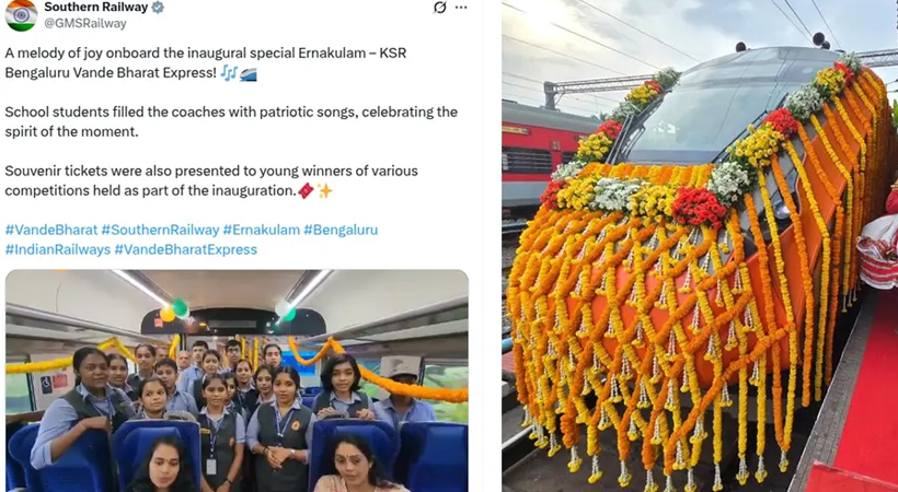 എറണാകുളം ബെംഗളൂരു വന്ദേഭാരത് ട്രെയിന് ഉദ്ഘാടന യാത്രയ്ക്കിടെ സ്കൂള് വിദ്യാര്ഥികള് ട്രെയിനില് ഗണ ഗീതം പാടുന്ന വിഡിയോയാണ് വിവാദമായത്. ദക്ഷിണ റെയില്വേ ഔദ്യോഗിക സമൂഹ മാധ്യമ അക്കൗണ്ടില് പോസ്റ്റ് ചെയ്ത വിഡിയോയ്ക്ക് എതിരെ പ്രതിഷേധം ഉയരുകയും പിന്നാലെ ദൃശ്യം നീക്കം ചെയ്യുകയുമായിരുന്നു. എന്നാൽ, രാത്രി ഇത് വീണ്ടും പോസ്റ്റ് ചെയ്തു.