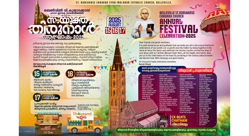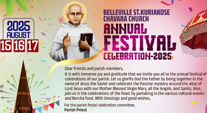 ബെൽവിൽ, ഒന്റാറിയോ, കാനഡ: സെൻ്റ് കുര്യാക്കോസ് സിറോ മലബാർ ദേവാലയത്തിലെ സംയുക്ത തിരുനാൾ ആഘോഷം ആഗസ്റ്റ് 15 മുതൽ 17 വരെ ഭക്തിനിബദ്ധതയോടെയും ആഘോഷോത്സാഹത്തോടെയും ആചരിക്കും. ആഗസ്റ്റ് 15, വെള്ളിയാഴ്ച വൈകിട്ട് 6.30ന് ആരംഭിക്കുന്ന തിരുനാൾ ആഘോഷത്തിൽ ആരാധന, വിശുദ്ധ കുർബാന, നേർച്ച വിഭവ വിതരണങ്ങൾ തുടങ്ങിയവ ഉണ്ടായിരിക്കും.