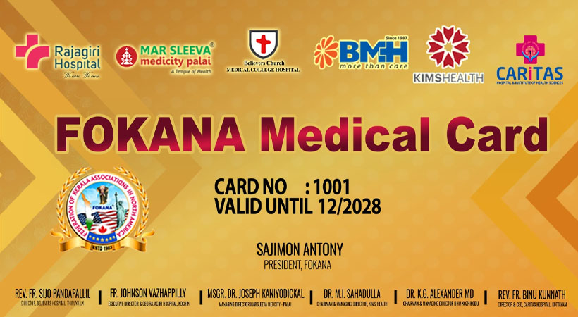 കേരളത്തിലെ പ്രധാനപ്പെട്ട സിറ്റികളിലെ ആറു സുപ്രാധന ഹോസ്പിറ്റലുകളെ ഉള്ക്കൊള്ളിച്ചുകൊണ്ടാണ് ഫൊക്കാന മെഡിക്കല് കാര്ഡ് നിലവില് വന്നത്. കൊച്ചി രാജഗിരി ഹോസ്പിറ്റല്, പാല മെഡി സിറ്റി, തിരുവല്ല ബിലീവേഴ്സ് ഹോസ്പിറ്റല്, ബേബി മെമ്മോറിയല് ഹോസ്പിറ്റല് കോഴിക്കോട് ,കിംസ് ഹോസ്പിറ്റല് തിരുവനന്തപുരം, കാരിത്താസ് കോട്ടയം എന്നി ഹോസ്പിറ്റലുകളുമായാണ് ഫൊക്കാന ഹെല്ത്ത് കാര്ഡ് അഫിലിയേറ്റ് ചെയ്തിരിക്കുന്നത്.