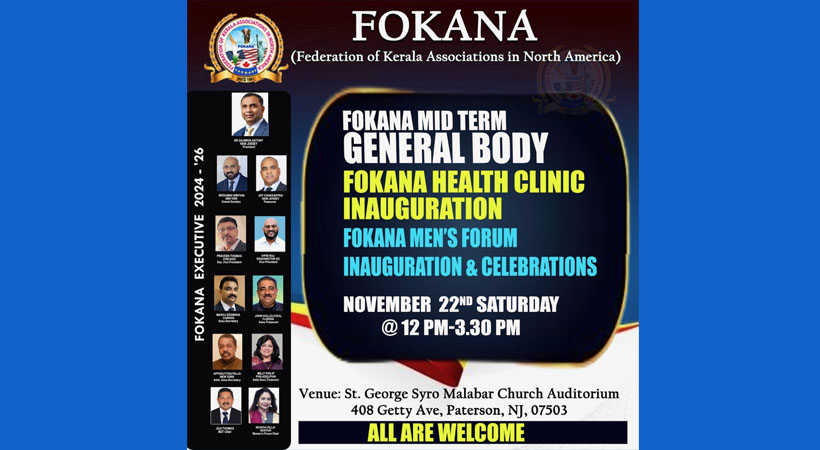 ന്യൂ യോർക്ക് : നോര്ത്ത് അമേരിക്കയിലെ മലയാളി സംഘടനകളുടെ സംഘടനയായ ഫൊക്കാനയുടെ (ഫെഡറേഷൻ ഓഫ് കേരളാ അസ്സോസിയേഷൻസ് ഇൻ നോർത്ത് അമേരിക്ക) മിഡ്ടെം ജനറല് ബോഡി മീറ്റിംഗ് 2025 നവംബർ 22 ,ശനിയാഴ്ച ഉച്ചക്ക് 12 മണി മുതൽ സെന്റ്. ജോർജ് സിറോ മലബാർ ചർച്ച് ഓഡിറ്റോറിയത്തിൽ ( 408 Getty Avenue, Paterson, NJ 07503) വെച്ച് നടത്തുന്നതാണ് എന്ന് പ്രസിഡന്റ് സജിമോൻ ആന്റണി, സെക്രട്ടറി ശ്രീകുമാർ ഉണ്ണിത്താൻ എന്നിവർ അറിയിച്ചു.